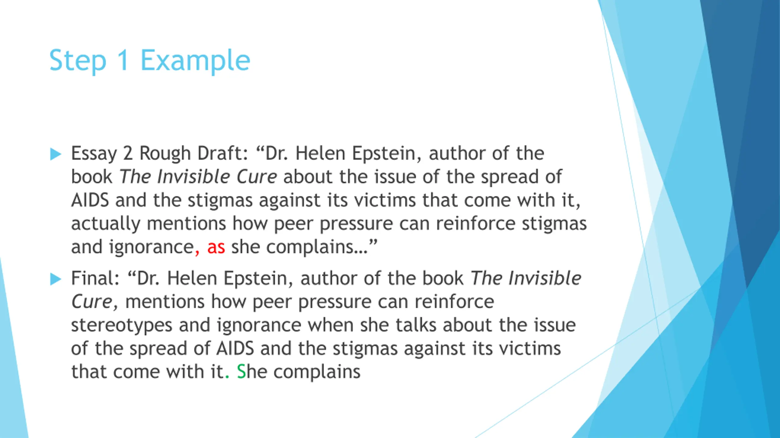 Step 1 Example Essay 2 Rough Draft: Dr. Helen Epstein, author of the book The Invisible Cure about the issue of the spread of AIDS and the stigmas against its victims that come with it, actually mentions how peer pressure can reinforce stigmas and ignorance, as she complains Final: Dr. Helen Epstein, author of the book The Invisible Cure, mentions how peer pressure can reinforce stereotypes and ignorance when shetalks aboutthe issue of the spread of AIDS and the stigmas against its victims that come with it. She complains