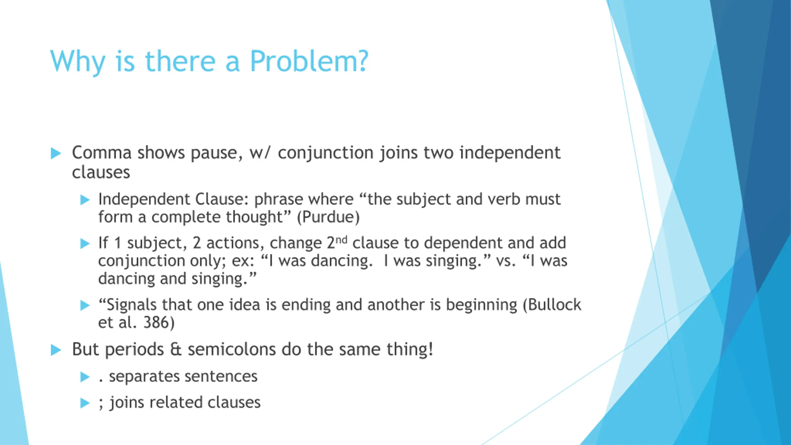Why is there a Problem? Comma shows pause, w/ conjunction joins two independent clauses Independent Clause: phrase where the subject and verb must form a complete thought (Purdue) If 1 subject, 2 actions, change 2nd clause to dependent and add conjunction only; ex: I was dancing. I was singing. vs. I was dancing and singing. Signals that one idea is ending and another is beginning (Bullock et al. 386) But periods & semicolons do the same thing! . separates sentences ; joins related clauses