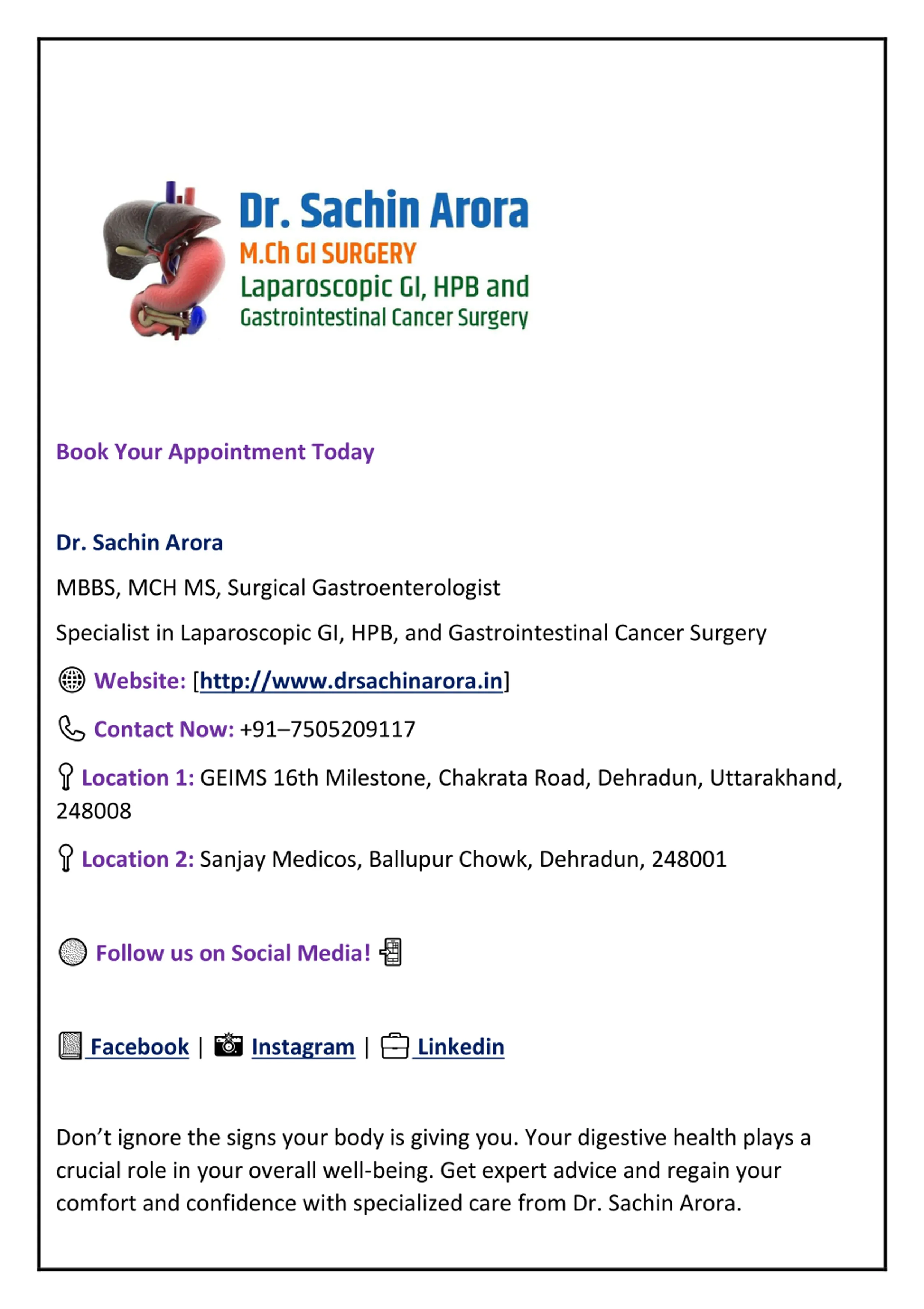 Book Your Appointment Today Dr. Sachin Arora MBBS, MCH MS, Surgical Gastroenterologist Specialist in Laparoscopic GI, HPB, and Gastrointestinal Cancer Surgery ?Website: [http://www.drsachinarora.in] ?Contact Now: +91 7505209117 ?Location 1: GEIMS 16th Milestone, Chakrata Road, Dehradun, Uttarakhand, 248008 ?Location 2: Sanjay Medicos, Ballupur Chowk, Dehradun, 248001 ?Follow us on Social Media!? ? Facebook | ? Instagram | ?Linkedin Don t ignore the signs your body is giving you. Your digestive health plays a crucial role in your overall well-being. Get expert advice and regain your comfort and confidence with specialized care from Dr. Sachin Arora.
