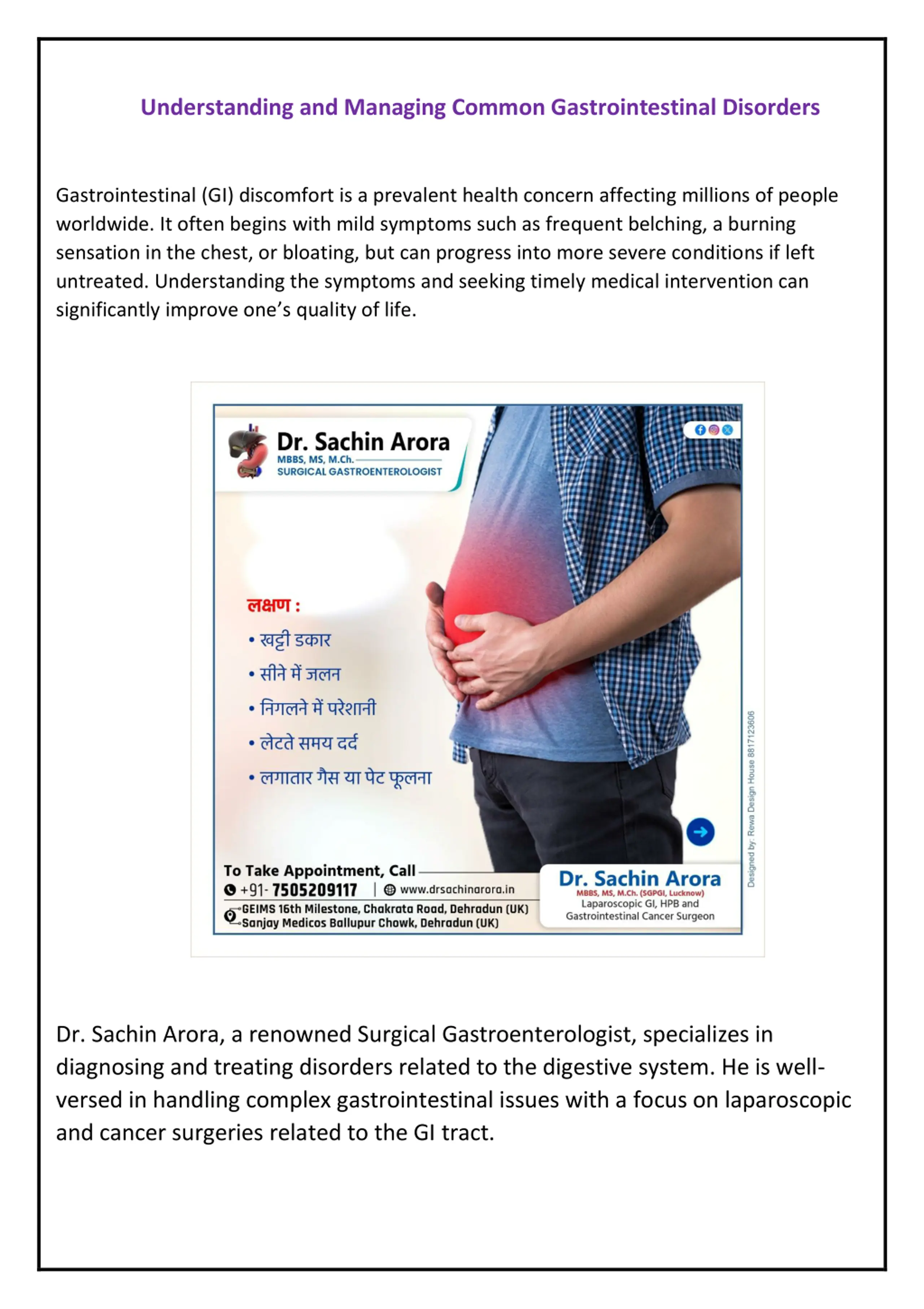 Understanding and Managing Common Gastrointestinal Disorders Gastrointestinal (GI) discomfort is a prevalent health concern affecting millions of people worldwide. It often begins with mild symptoms such as frequent belching, a burning sensation in the chest, or bloating, but can progress into more severe conditions if left untreated. Understanding the symptoms and seeking timely medical intervention can significantly improve one s quality of life. Dr. Sachin Arora, a renowned Surgical Gastroenterologist, specializes in diagnosing and treating disorders related to the digestive system. He is well- versed in handling complex gastrointestinal issues with a focus on laparoscopic and cancer surgeries related to the GI tract.