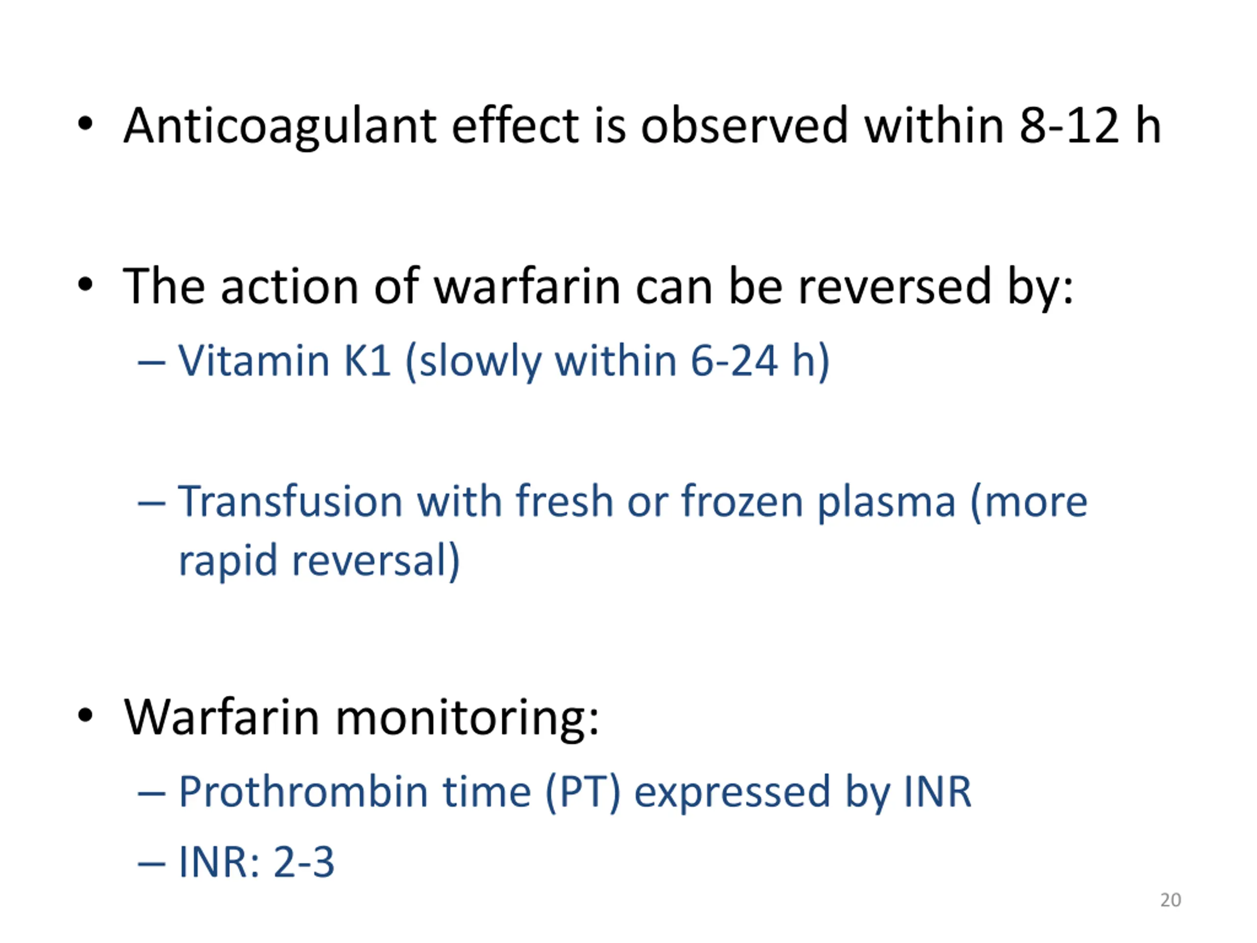 Anticoagulant effect is observed within 8-12 h The action of warfarin can be reversed by: Vitamin K1 (slowly within 6-24 h) Transfusion with fresh or frozen plasma (more rapid reversal) Warfarin monitoring: Prothrombin time (PT) expressed by INR INR: 2-3 20