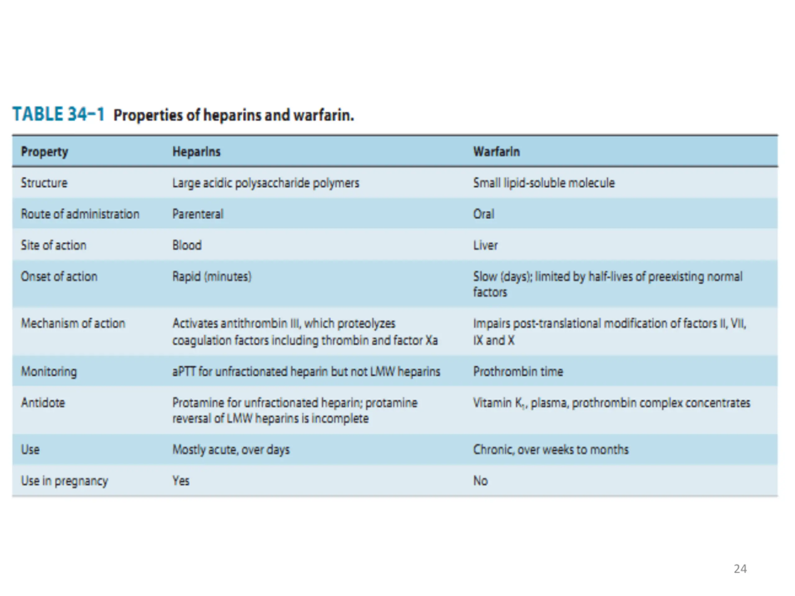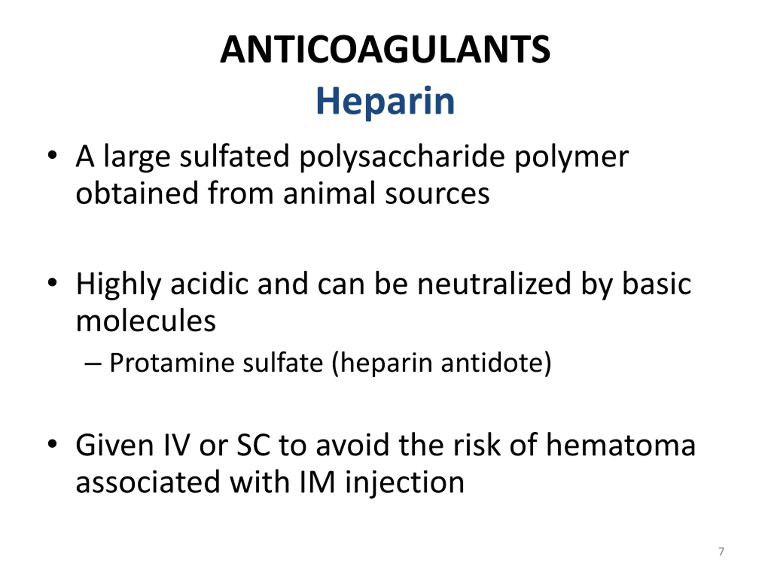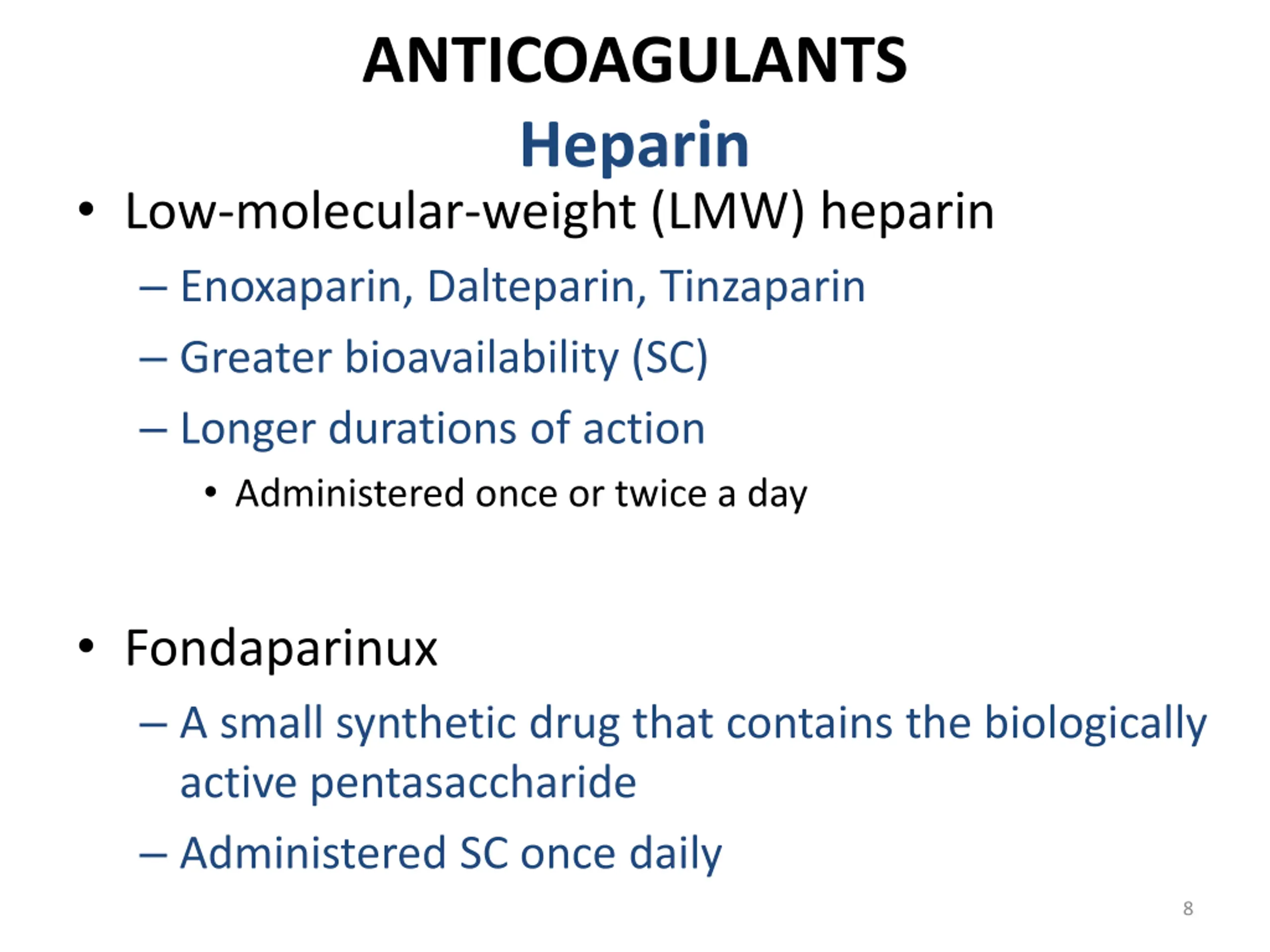ANTICOAGULANTS Heparin A large sulfated polysaccharide polymer obtained from animal sources Highly acidic and can be neutralized by basic molecules Protamine sulfate (heparin antidote) Given IV or SC to avoid the risk of hematoma associated with IM injection 7