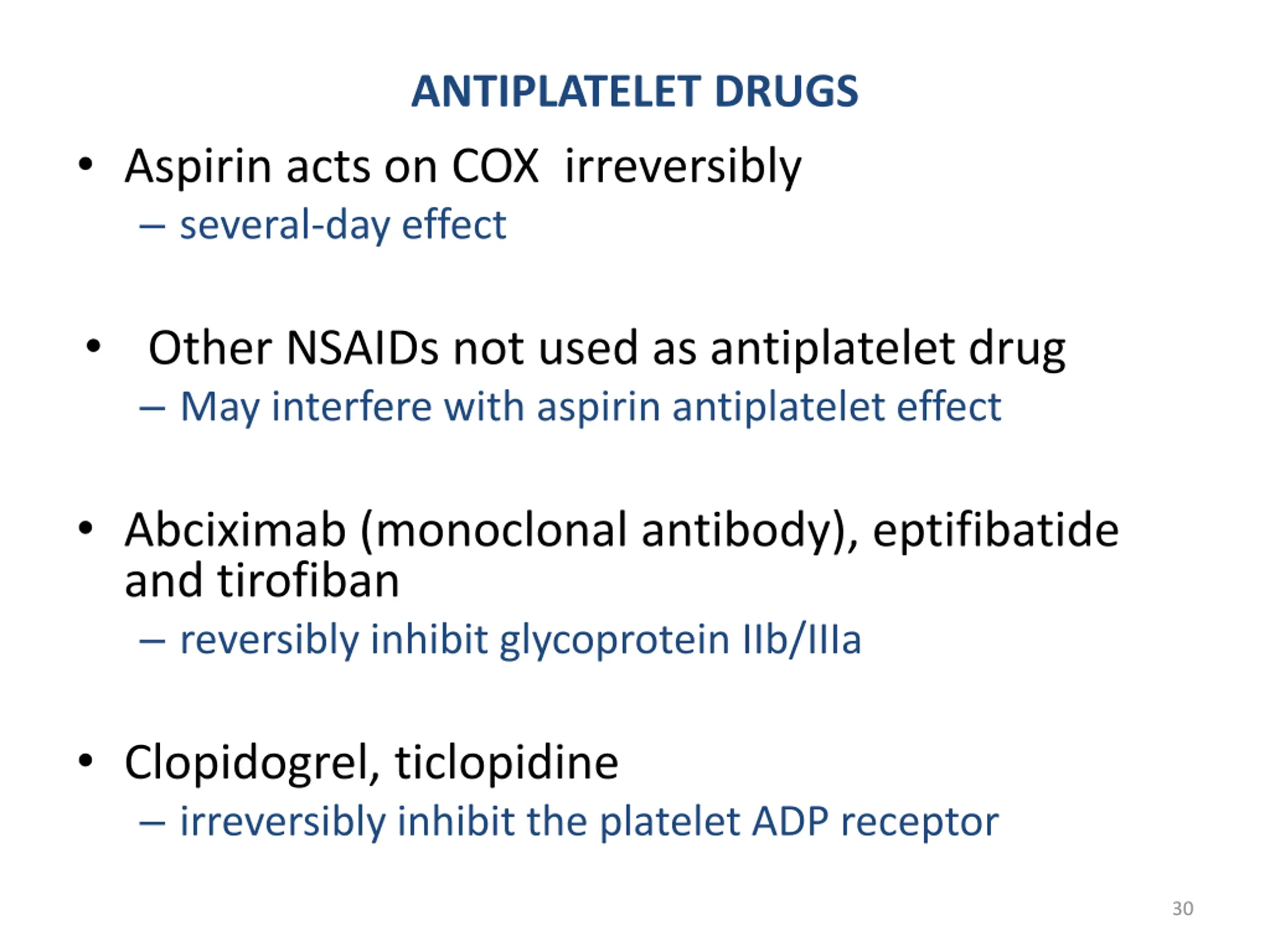 ANTIPLATELET DRUGS Aspirin acts on COX irreversibly several-day effect Other NSAIDs not used as antiplatelet drug May interfere with aspirin antiplatelet effect Abciximab (monoclonal antibody), eptifibatide and tirofiban reversibly inhibit glycoprotein IIb/IIIa Clopidogrel, ticlopidine irreversibly inhibit the platelet ADP receptor 30