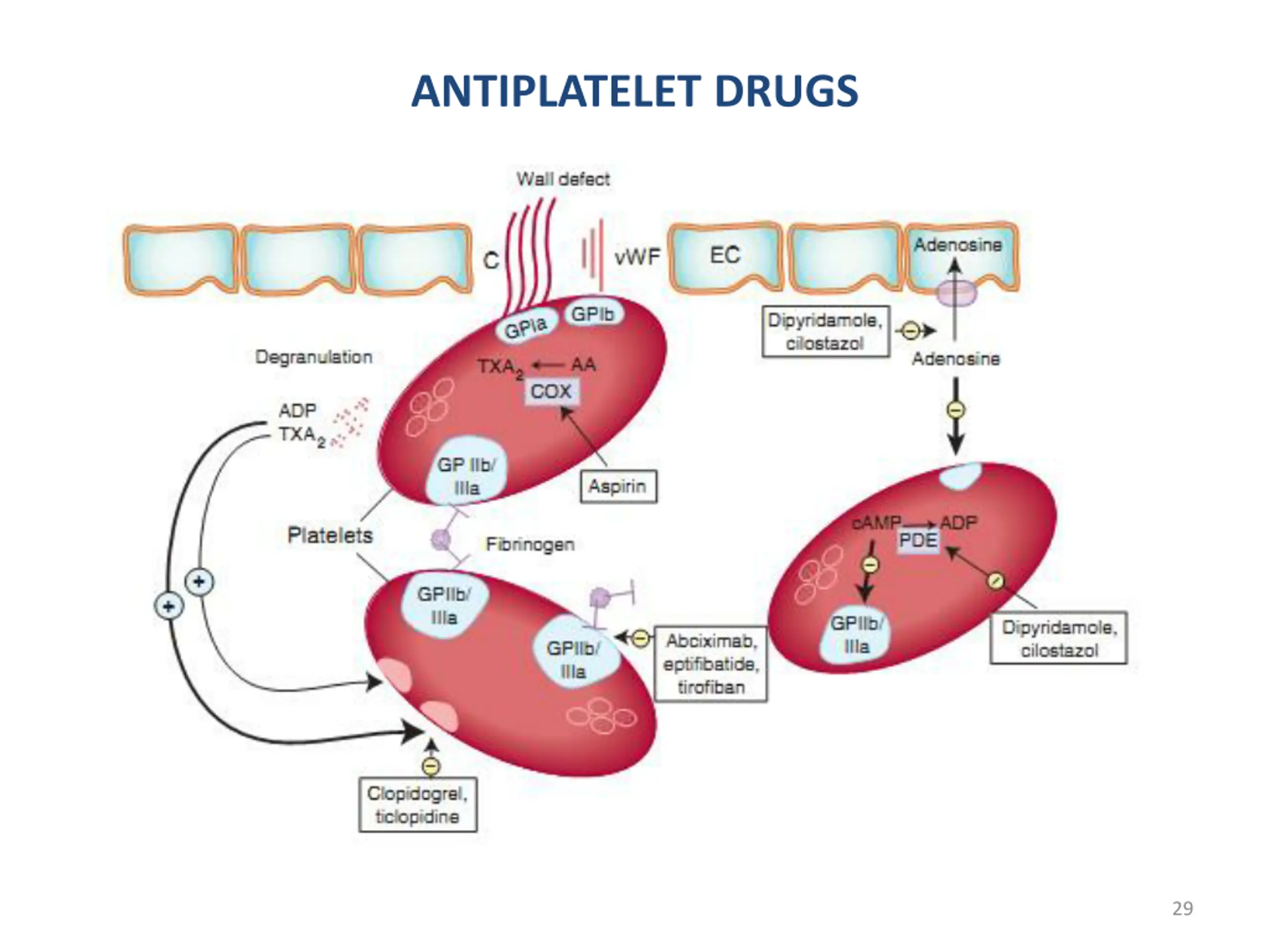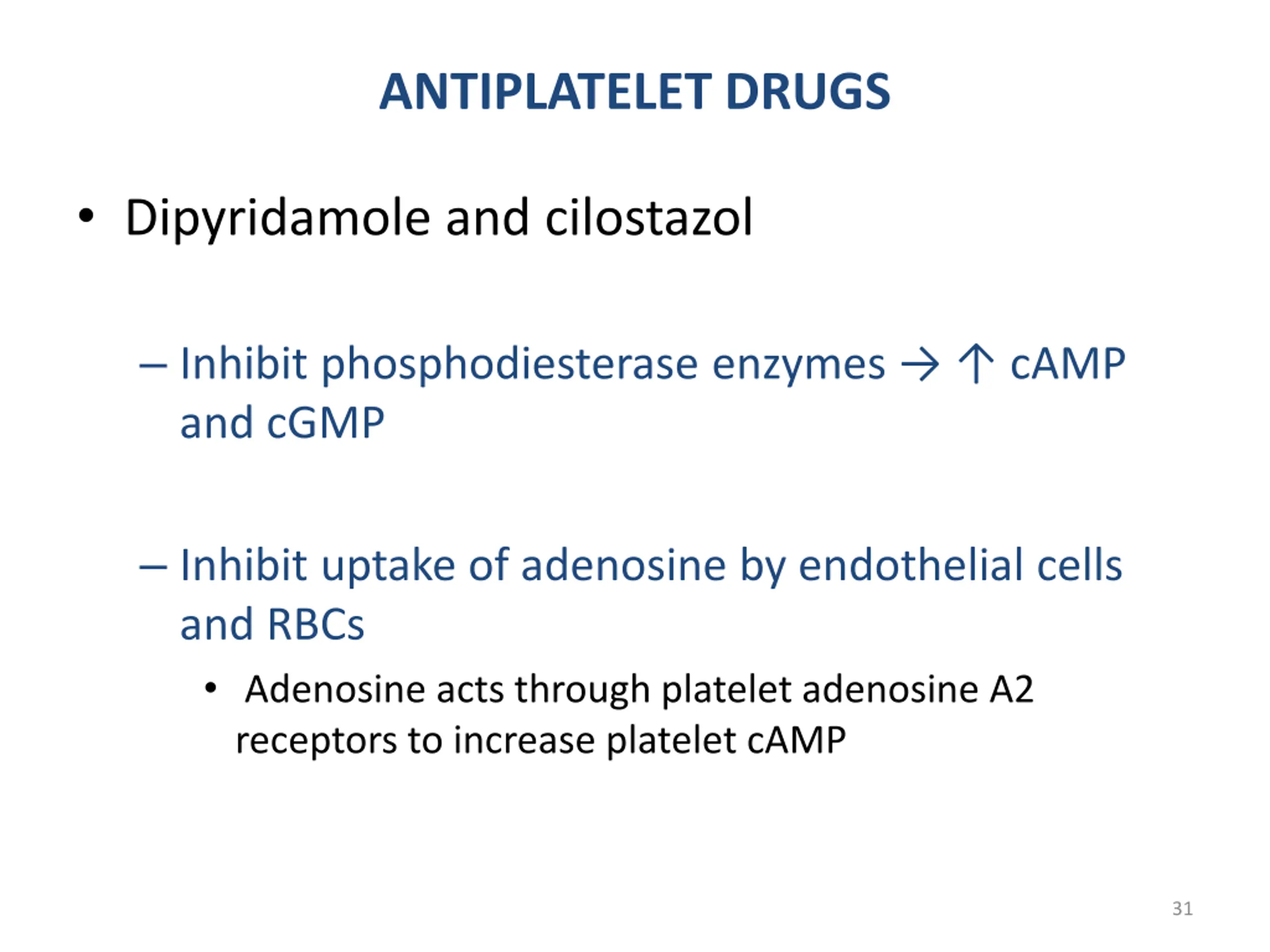 ANTIPLATELET DRUGS Dipyridamole and cilostazol Inhibit phosphodiesterase enzymes cAMP and cGMP Inhibit uptake of adenosine by endothelial cells and RBCs Adenosine acts through platelet adenosine A2 receptors to increase platelet cAMP 31