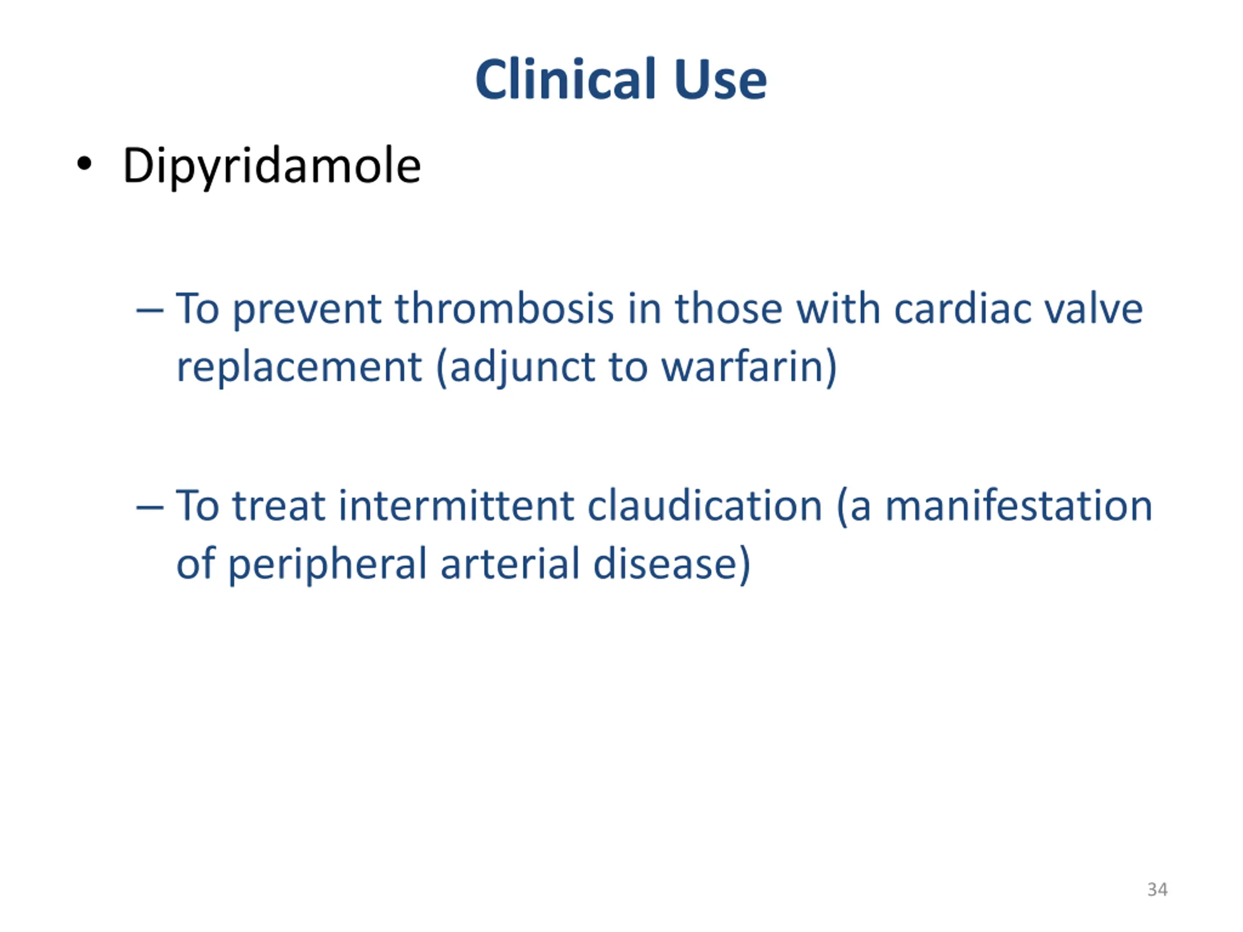 Clinical Use Dipyridamole To prevent thrombosis in those with cardiac valve replacement (adjunct to warfarin) To treat intermittent claudication (a manifestation of peripheral arterial disease) 34
