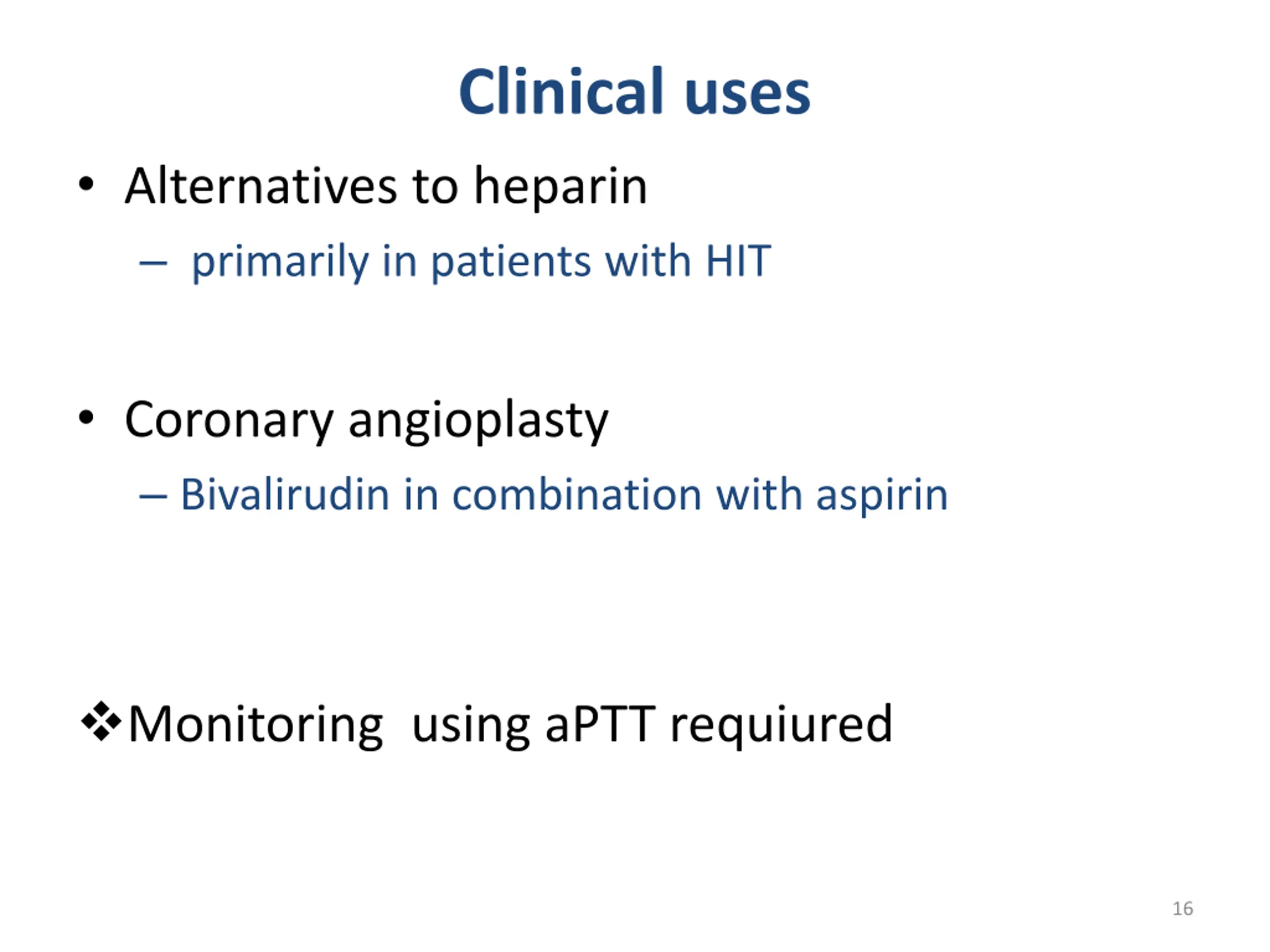 Clinical uses Alternatives to heparin primarily in patients with HIT Coronary angioplasty Bivalirudin in combination with aspirin Monitoring using aPTT requiured 16
