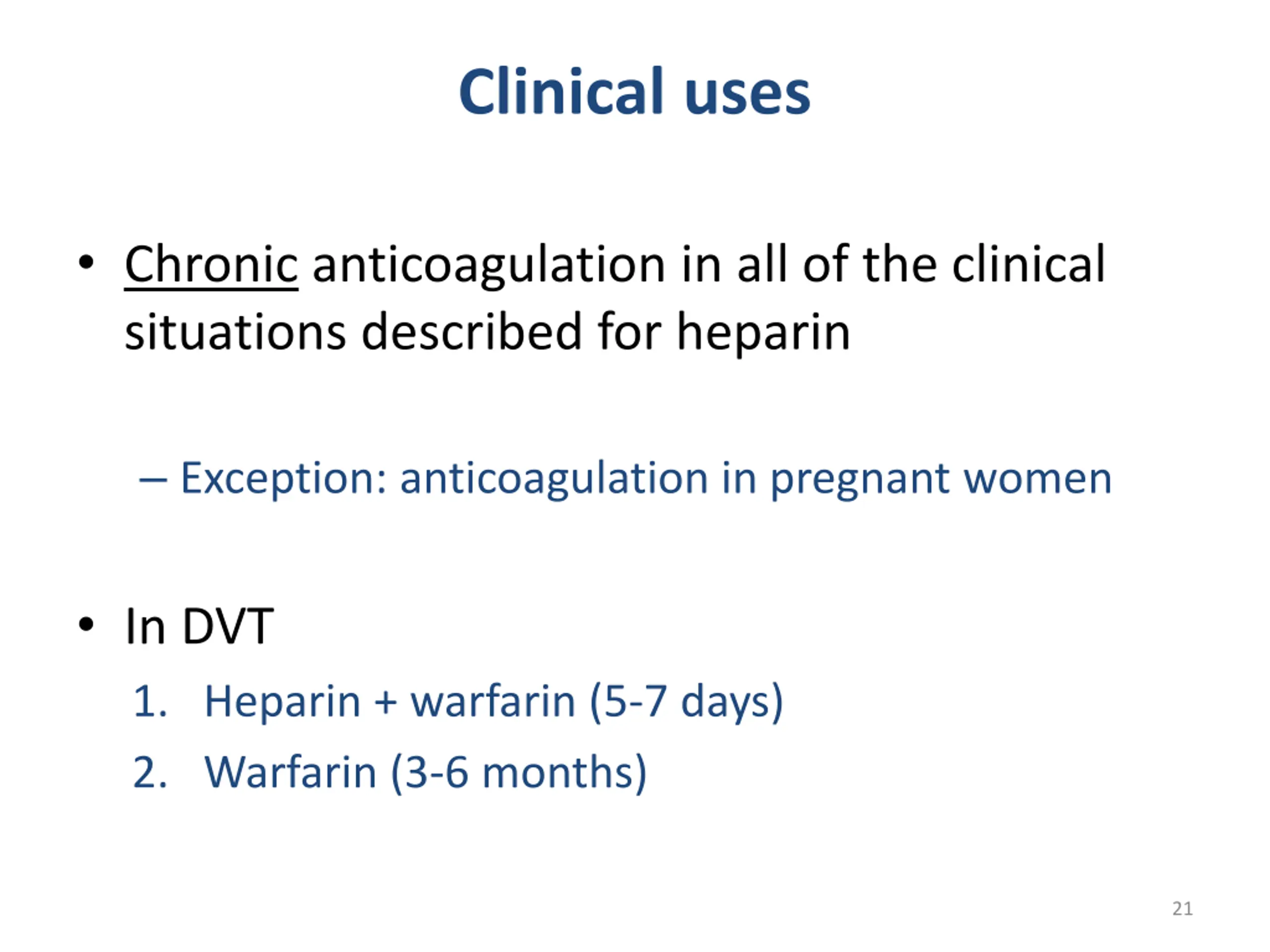 Clinical uses Chronic anticoagulation in all of the clinical situations described for heparin Exception: anticoagulation in pregnant women In DVT 1. Heparin + warfarin (5-7 days) 2. Warfarin (3-6 months) 21
