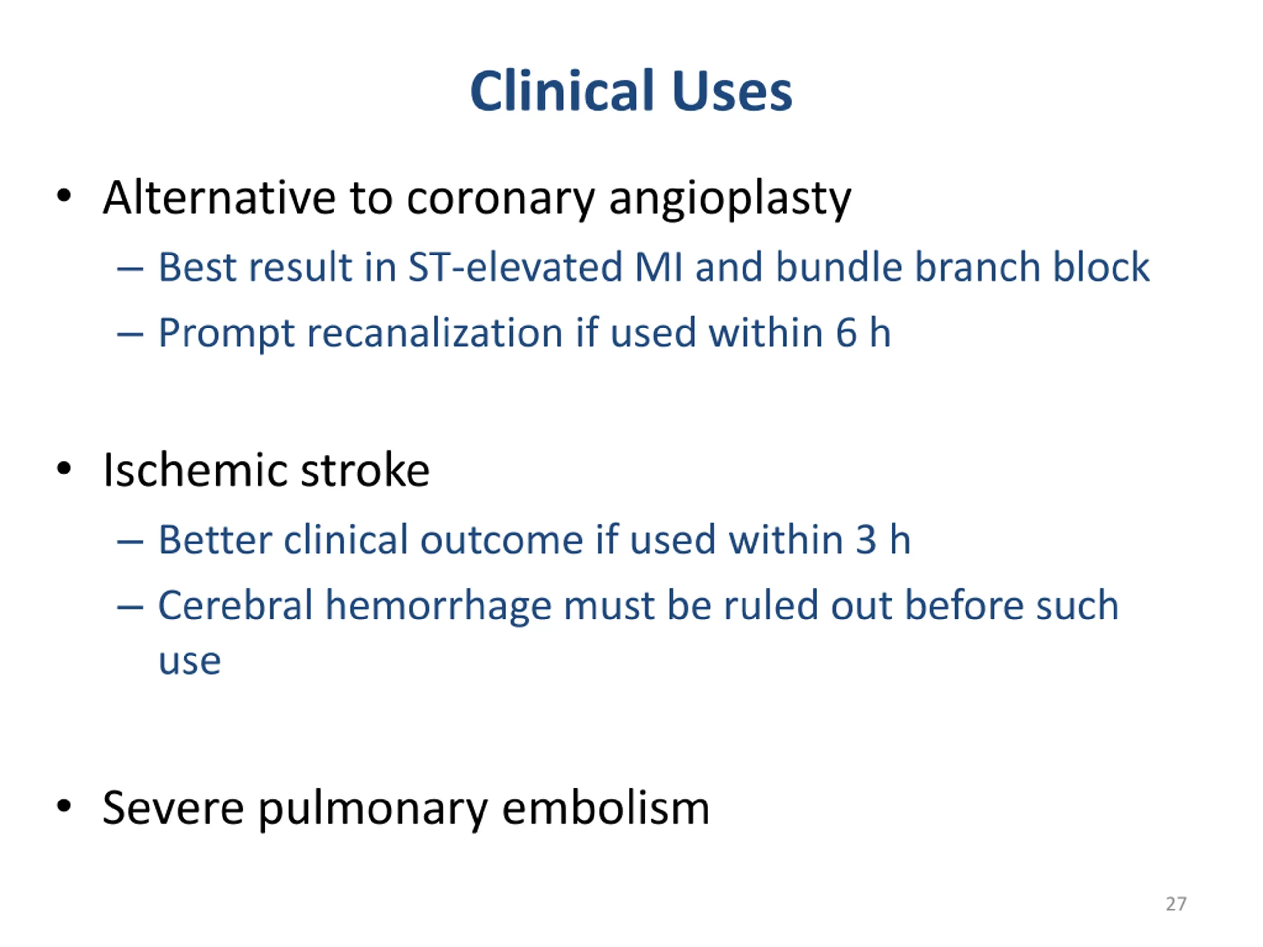 Clinical Uses Alternative to coronary angioplasty Best result in ST-elevated MI and bundle branch block Prompt recanalization if used within 6 h Ischemic stroke Better clinical outcome if used within 3 h Cerebral hemorrhage must be ruled out before such use Severe pulmonary embolism 27