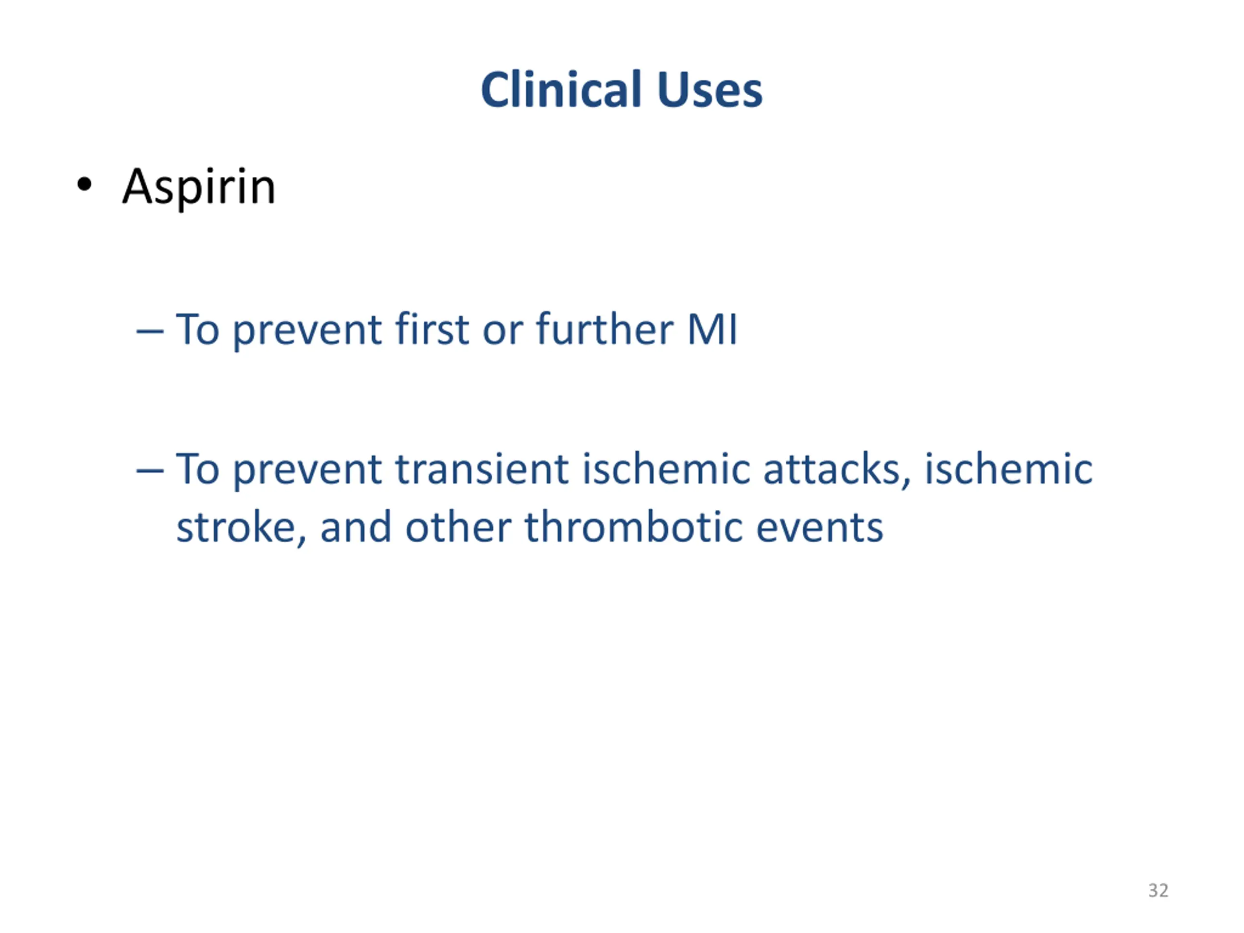 Clinical Uses Aspirin To prevent first or further MI To prevent transient ischemic attacks, ischemic stroke, and other thrombotic events 32