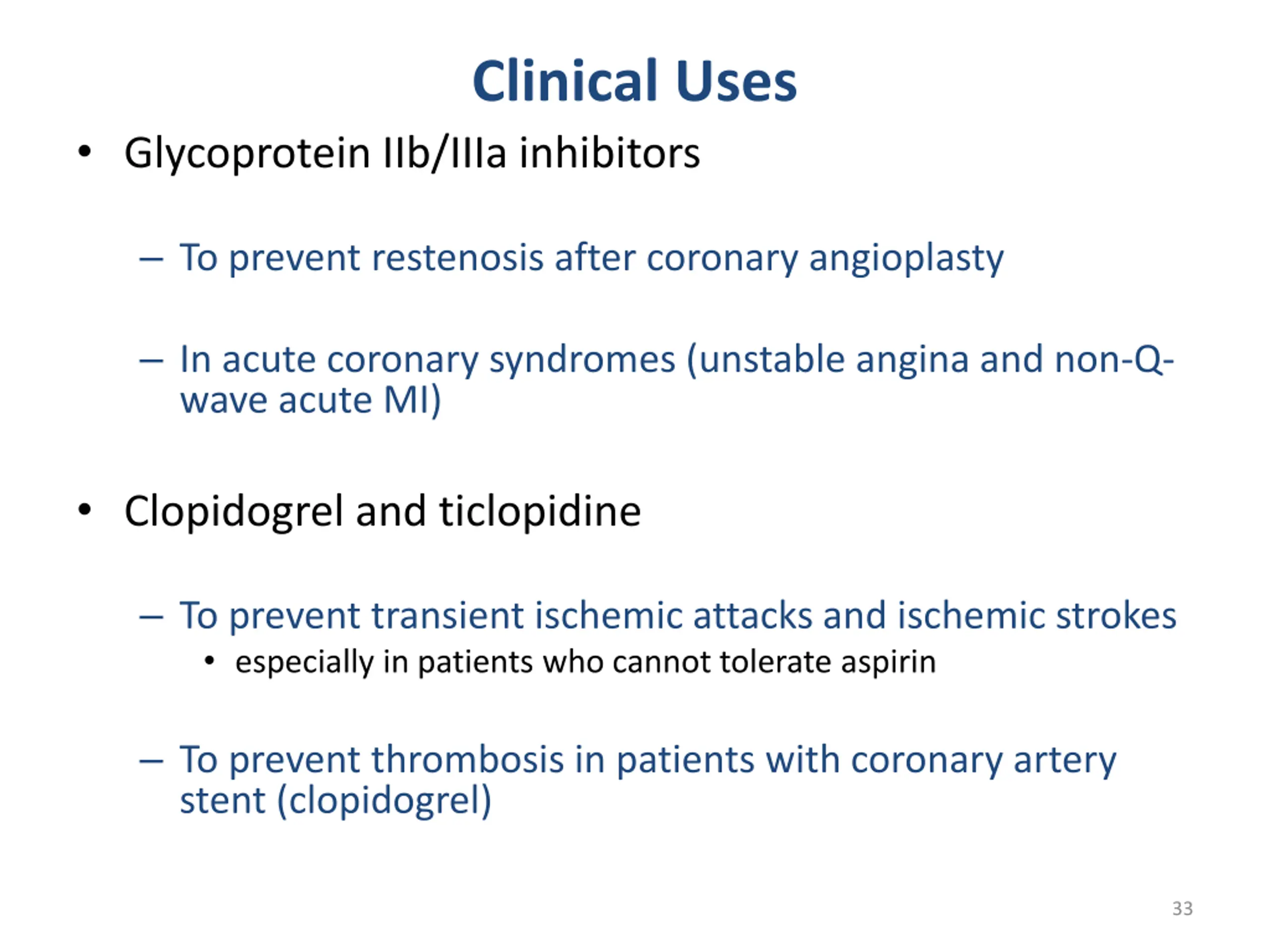 Clinical Uses Glycoprotein IIb/IIIa inhibitors To prevent restenosis after coronary angioplasty In acute coronary syndromes (unstable angina and non-Q- wave acute MI) Clopidogrel and ticlopidine To prevent transient ischemic attacks and ischemic strokes especially in patients who cannot tolerate aspirin To prevent thrombosis in patients with coronary artery stent (clopidogrel) 33