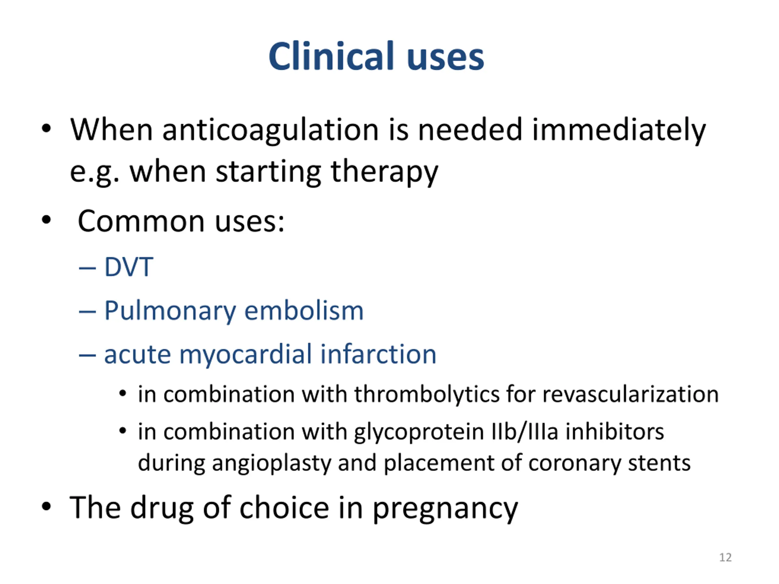 Clinical uses When anticoagulation is needed immediately e.g. when starting therapy Common uses: DVT Pulmonary embolism acute myocardial infarction in combination with thrombolytics for revascularization in combination with glycoprotein IIb/IIIa inhibitors during angioplasty and placement of coronary stents The drug of choice in pregnancy 12