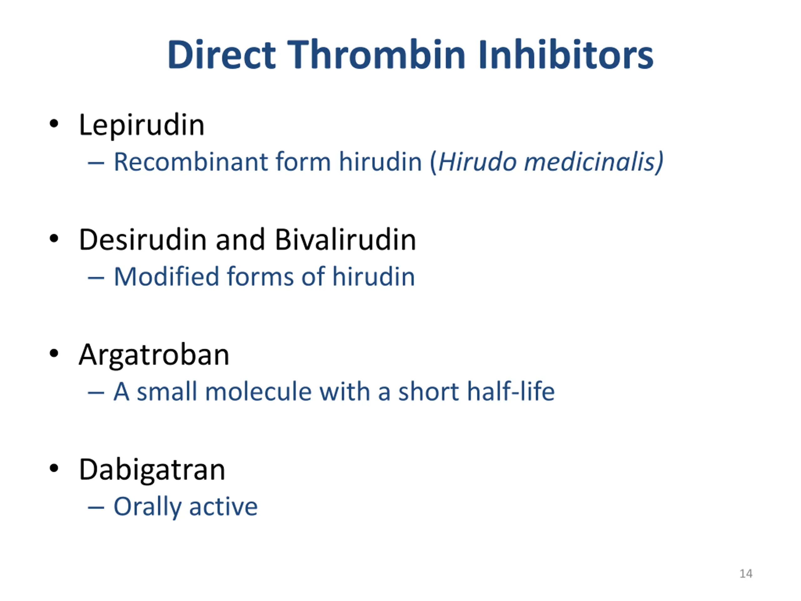 Direct Thrombin Inhibitors Lepirudin Recombinant form hirudin (Hirudo medicinalis) Desirudin and Bivalirudin Modified forms of hirudin Argatroban A small molecule with a short half-life Dabigatran Orally active 14