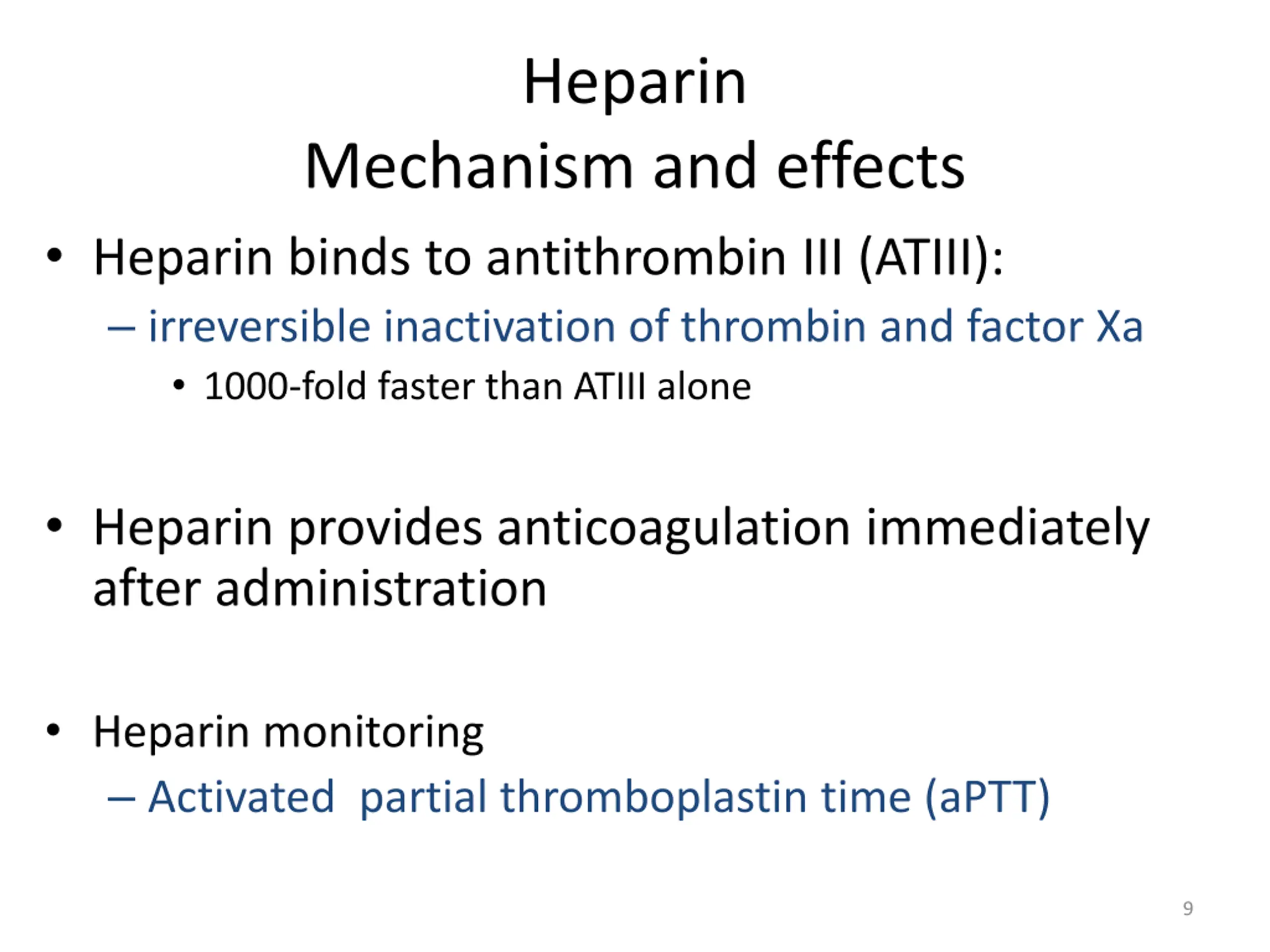 Heparin Mechanism and effects Heparin binds to antithrombin III (ATIII): irreversible inactivation of thrombin and factor Xa 1000-fold faster than ATIII alone Heparin provides anticoagulation immediately after administration Heparin monitoring Activated partial thromboplastin time (aPTT) 9