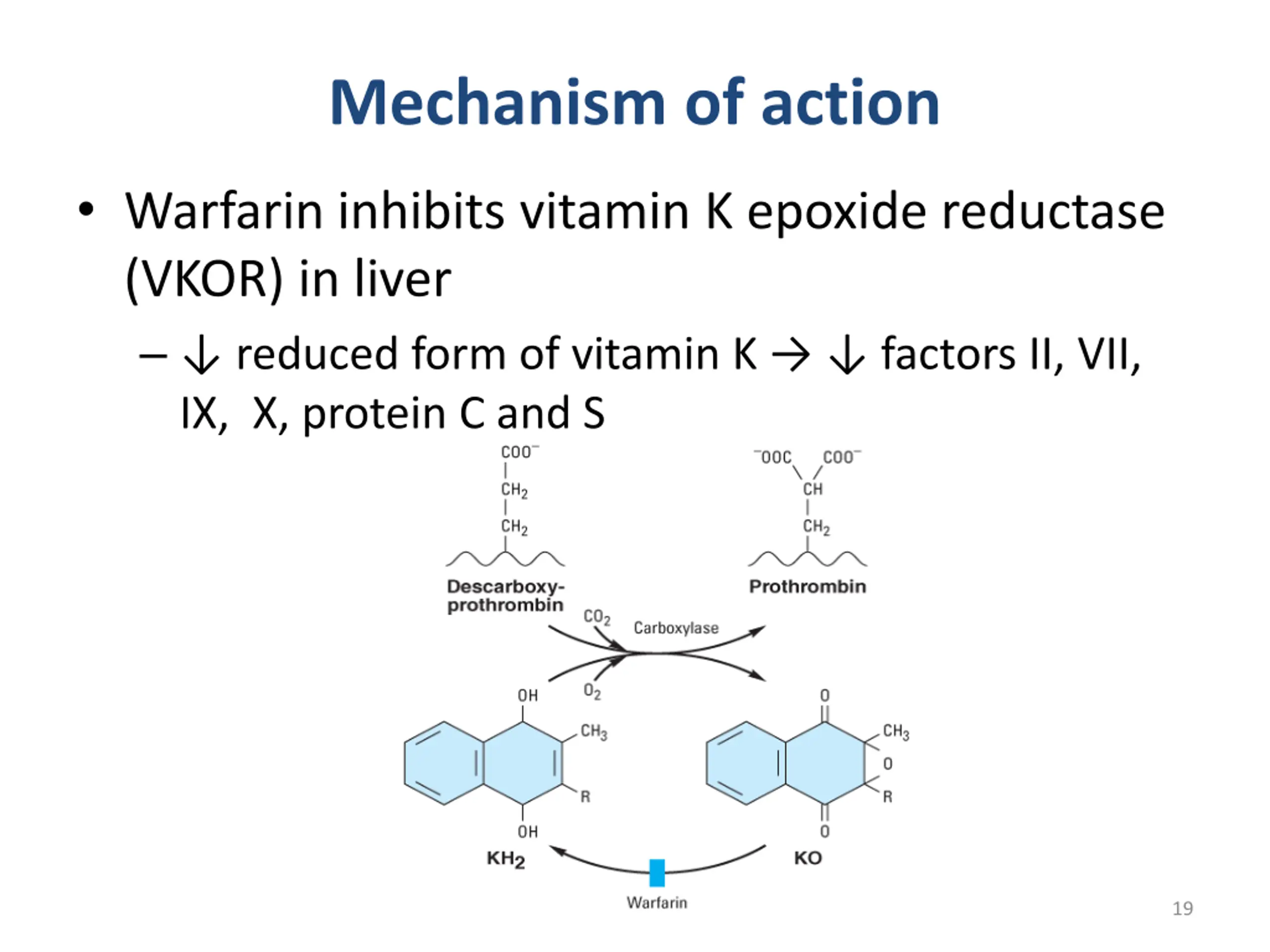 Mechanism of action Warfarin inhibits vitamin K epoxide reductase (VKOR) in liver reduced form of vitamin K factors II, VII, IX, X, protein C and S 19