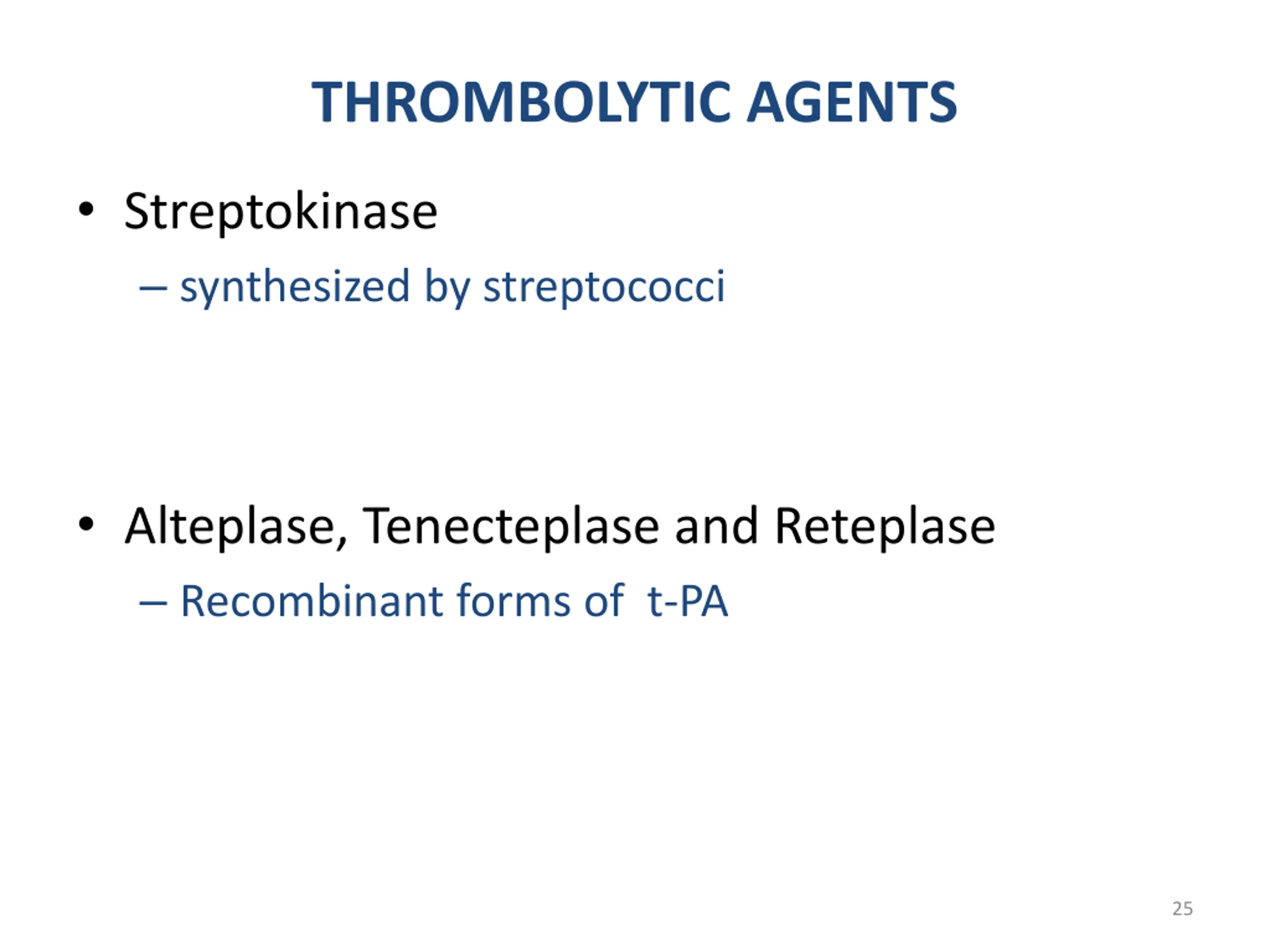 THROMBOLYTIC AGENTS Streptokinase synthesized by streptococci Alteplase, Tenecteplase and Reteplase Recombinant forms of t-PA 25