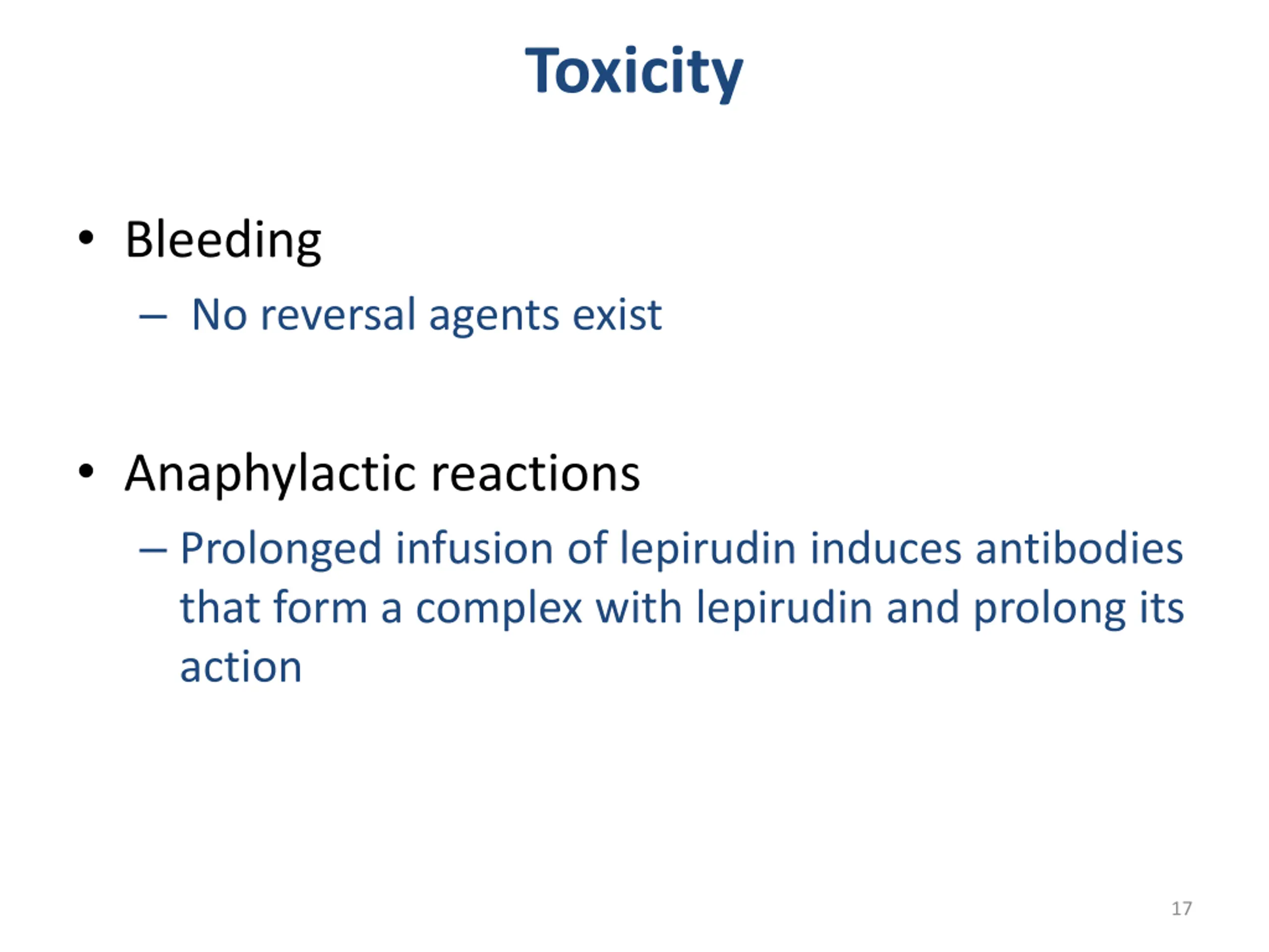 Toxicity Bleeding No reversal agents exist Anaphylactic reactions Prolonged infusion of lepirudin induces antibodies that form a complex with lepirudin and prolong its action 17