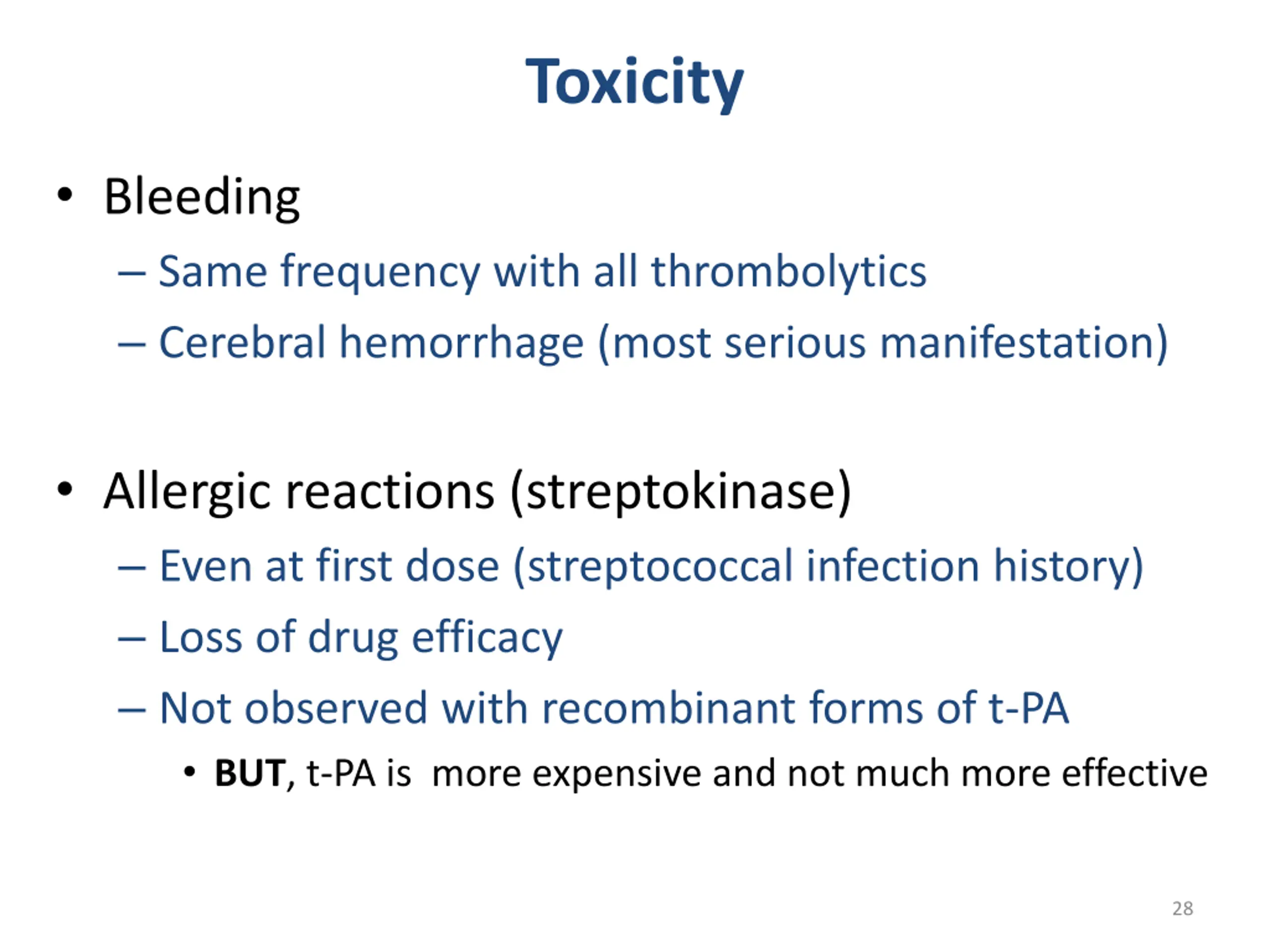 Toxicity Bleeding Same frequency with all thrombolytics Cerebral hemorrhage (most serious manifestation) Allergic reactions (streptokinase) Even at first dose (streptococcal infection history) Loss of drug efficacy Not observed with recombinant forms of t-PA BUT, t-PA is more expensive and not much more effective 28