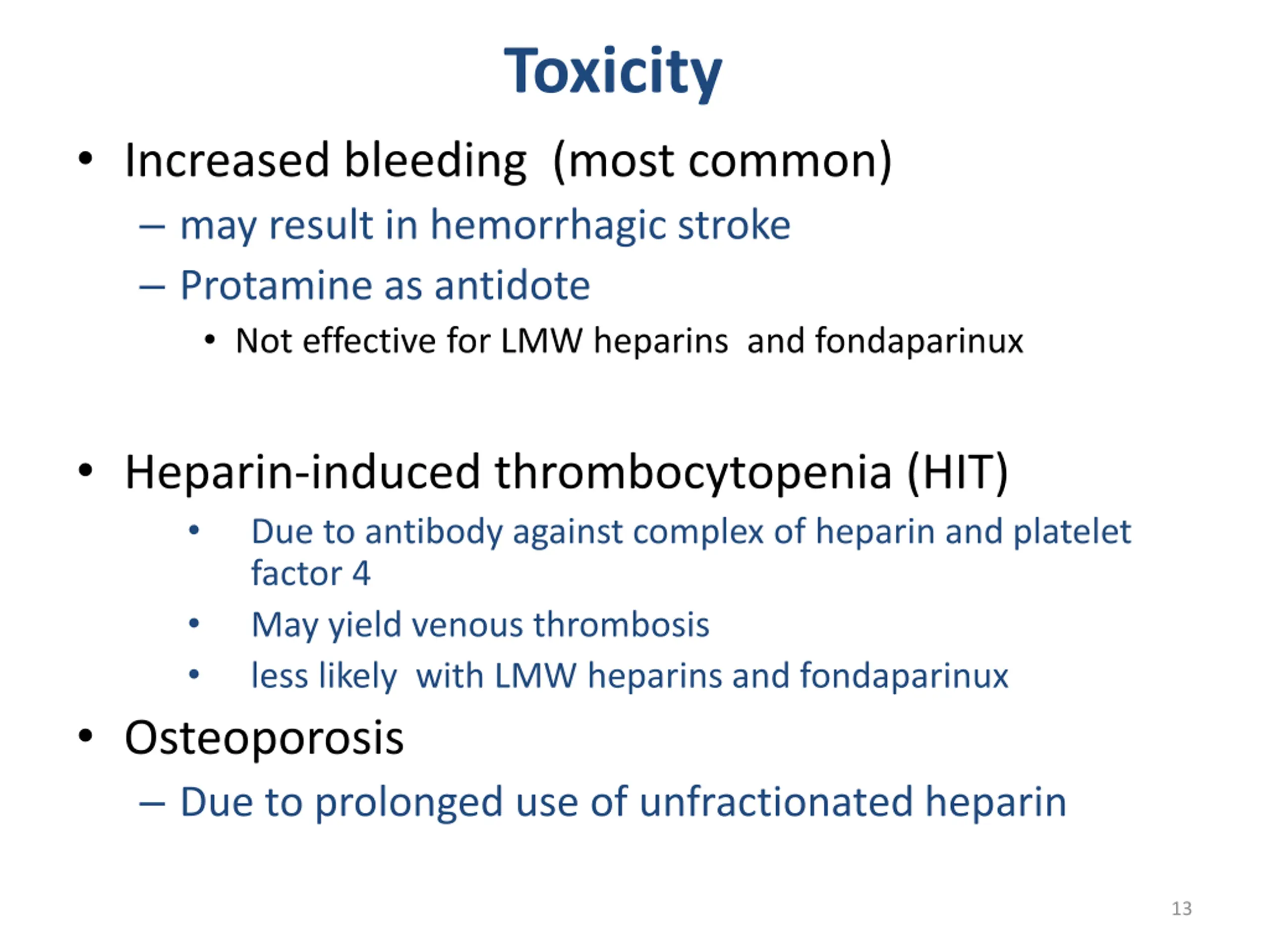 Toxicity Increased bleeding (most common) may result in hemorrhagic stroke Protamine as antidote Not effective for LMW heparins and fondaparinux Heparin-induced thrombocytopenia (HIT) Due to antibody against complex of heparin and platelet factor 4 May yield venous thrombosis less likely with LMW heparins and fondaparinux Osteoporosis Due to prolonged use of unfractionated heparin 13