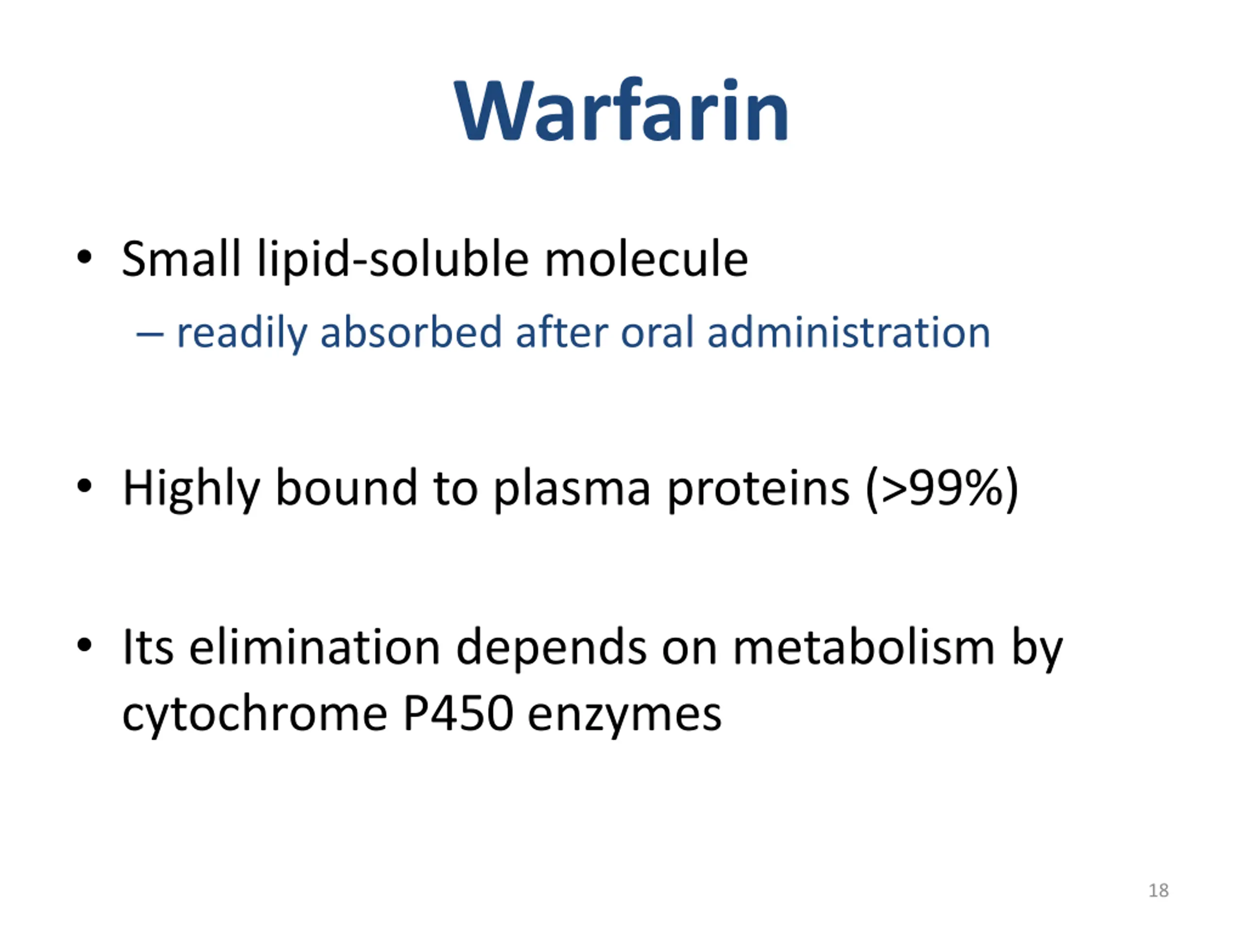 Warfarin Small lipid-soluble molecule readily absorbed after oral administration Highly bound to plasma proteins (>99%) Its elimination depends on metabolism by cytochrome P450 enzymes 18