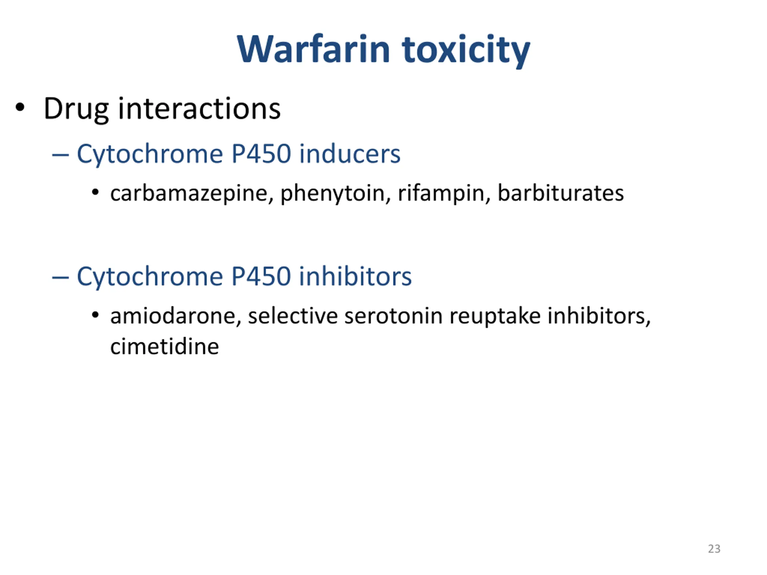 Warfarin toxicity Drug interactions Cytochrome P450 inducers carbamazepine, phenytoin, rifampin, barbiturates Cytochrome P450 inhibitors amiodarone, selective serotonin reuptake inhibitors, cimetidine 23