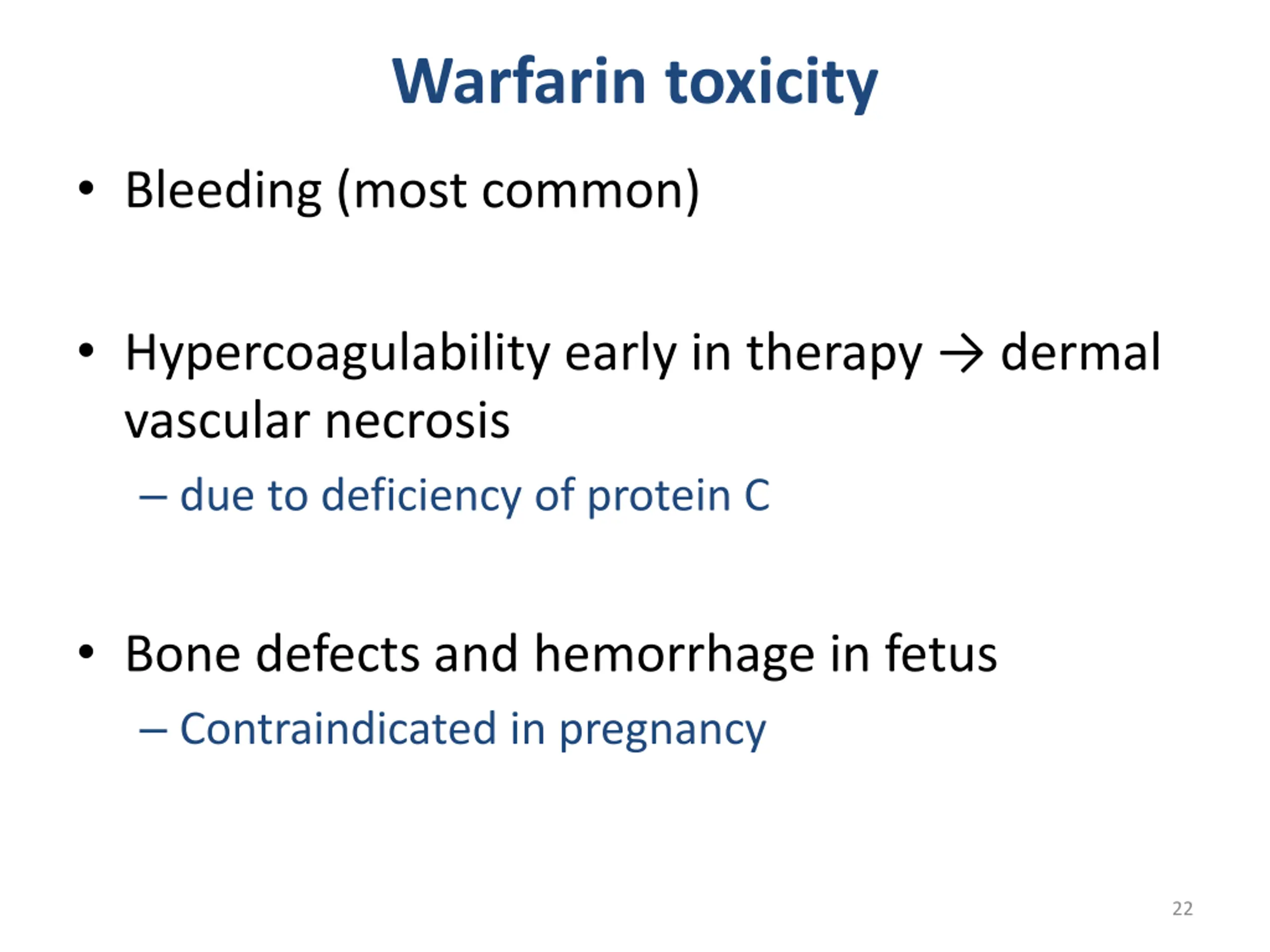 Warfarin toxicity Bleeding (most common) Hypercoagulability early in therapy dermal vascular necrosis due to deficiency of protein C Bone defects and hemorrhage in fetus Contraindicated in pregnancy 22