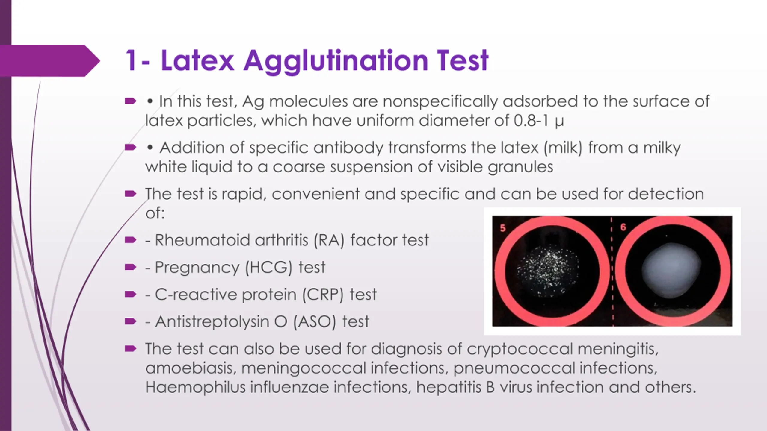 1- Latex Agglutination Test In this test, Ag molecules are nonspecifically adsorbed to the surface of latex particles, which have uniform diameter of 0.8-1 Addition of specific antibody transforms the latex (milk) from a milky white liquid to a coarse suspension of visible granules The test is rapid, convenient and specific and can be used for detection of: - Rheumatoid arthritis (RA) factor test - Pregnancy (HCG) test - C-reactive protein (CRP) test - Antistreptolysin O (ASO) test The test can also be used for diagnosis of cryptococcal meningitis, amoebiasis, meningococcal infections, pneumococcal infections, Haemophilus influenzae infections, hepatitis B virus infection and others.