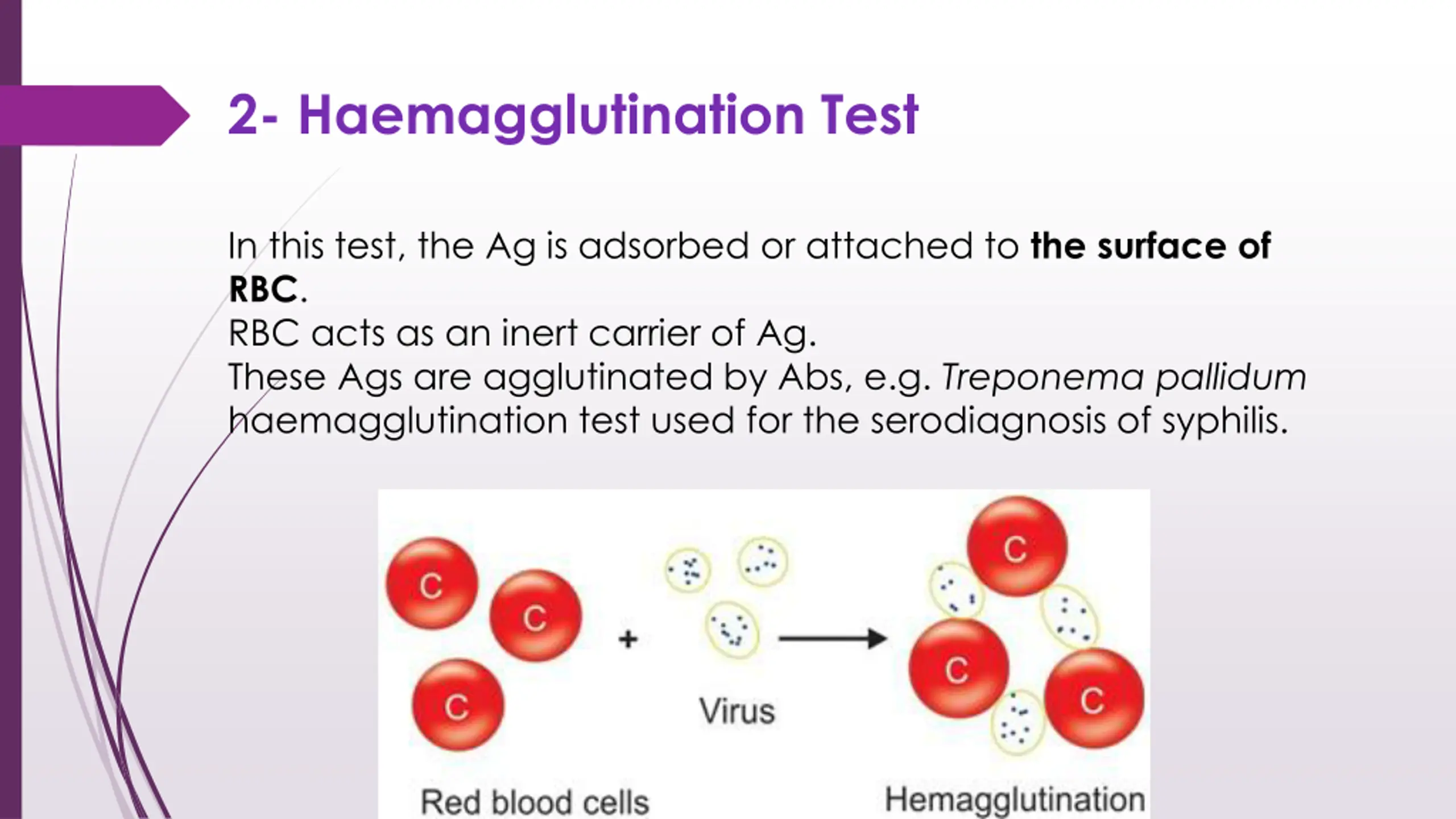 2- Haemagglutination Test In this test, the Ag is adsorbed or attached to the surface of RBC. RBC acts as an inert carrier of Ag. These Ags are agglutinated by Abs, e.g. Treponema pallidum haemagglutination test used for the serodiagnosis of syphilis.