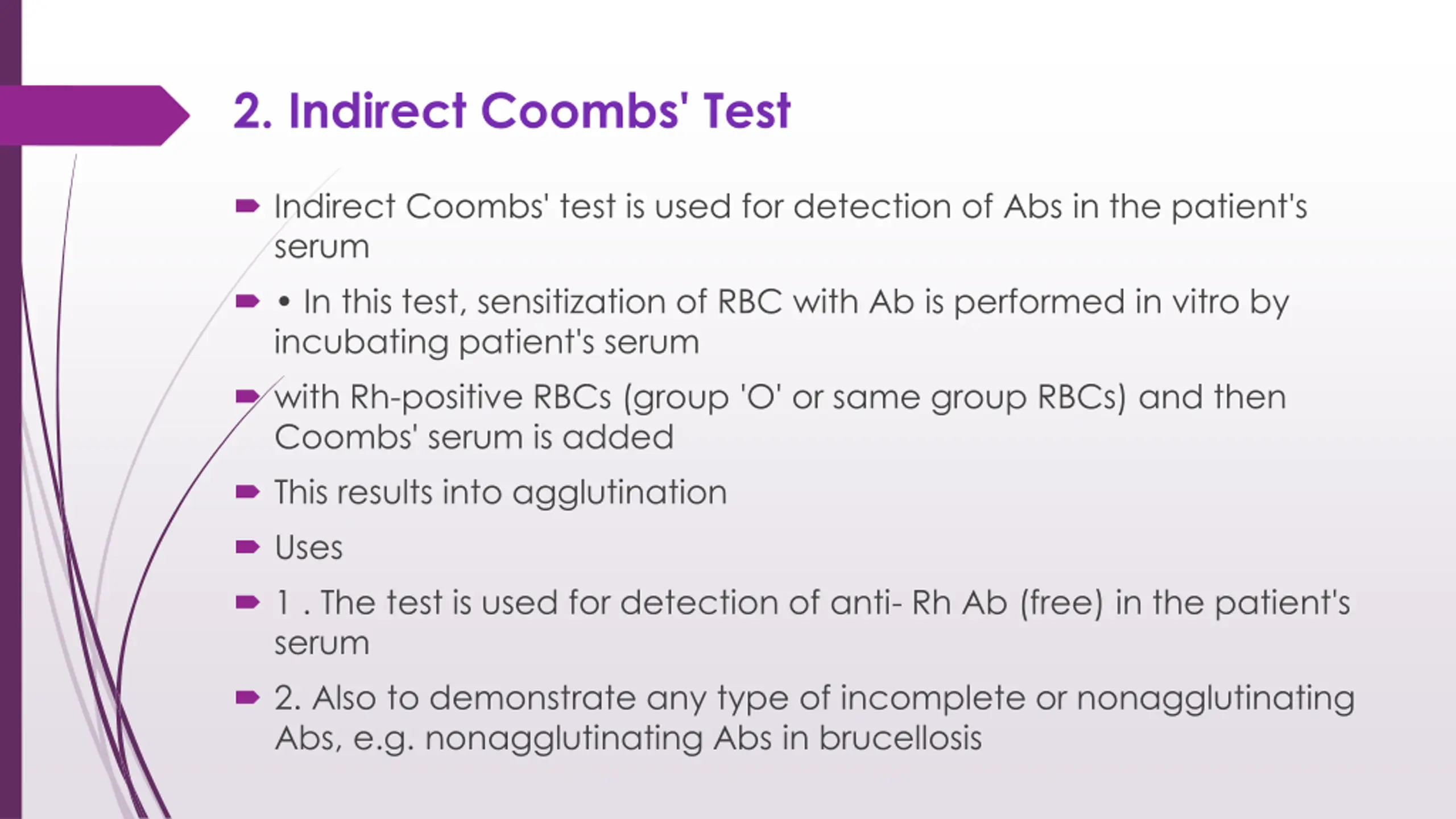 2. Indirect Coombs' Test Indirect Coombs' test is used for detection of Abs in the patient's serum In this test, sensitization of RBC with Ab is performed in vitro by incubating patient's serum with Rh-positive RBCs (group 'O' or same group RBCs) and then Coombs' serum is added This results into agglutination Uses 1 . The test is used for detection of anti- Rh Ab (free) in the patient's serum 2. Also to demonstrate any type of incomplete or nonagglutinating Abs, e.g. nonagglutinating Abs in brucellosis