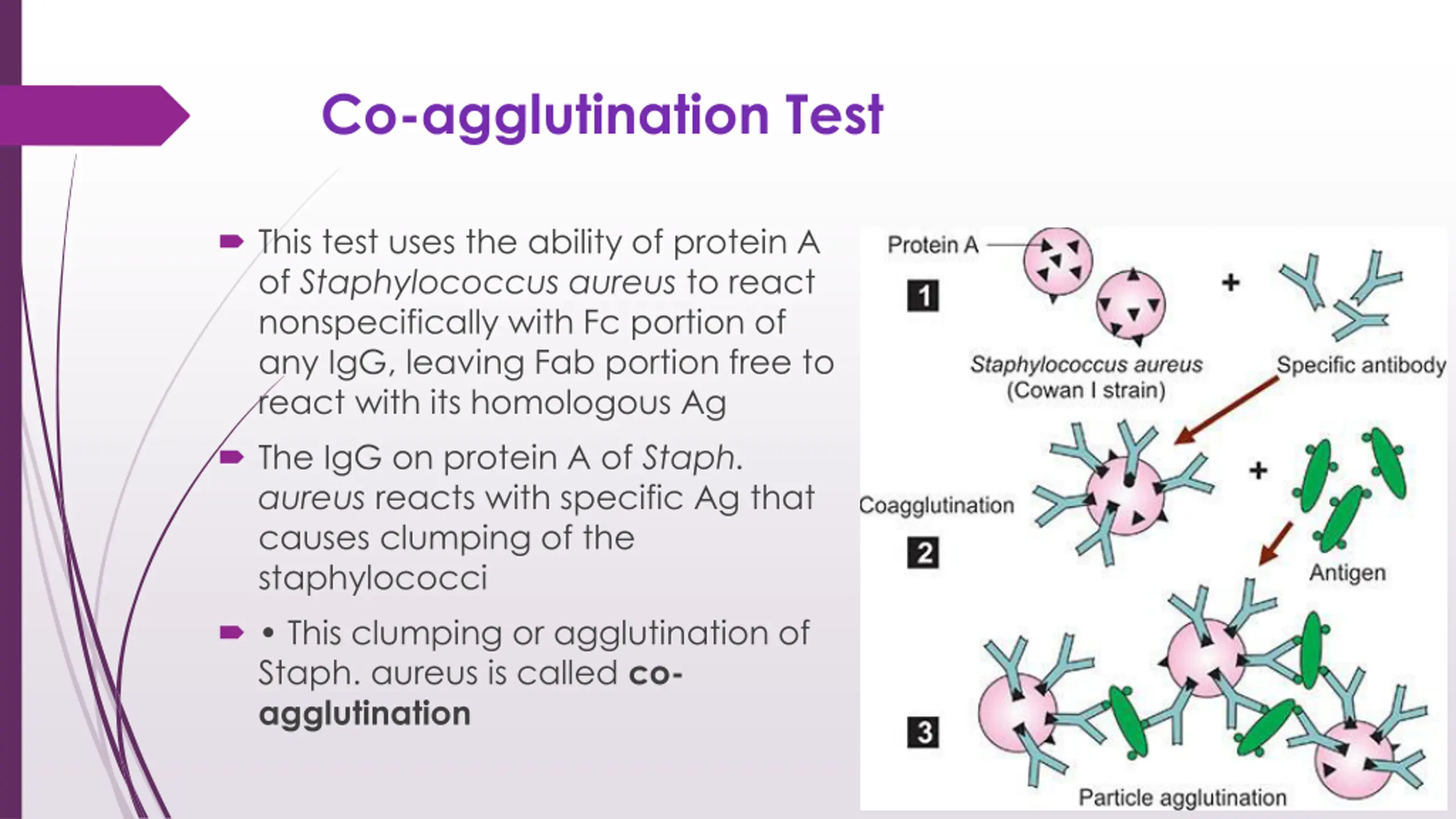 Co-agglutination Test This test uses the ability of protein A of Staphylococcus aureus to react nonspecifically with Fc portion of any IgG, leaving Fab portion free to react with its homologous Ag The IgG on protein A of Staph. aureus reacts with specific Ag that causes clumping of the staphylococci This clumping or agglutination of Staph. aureus is called co- agglutination