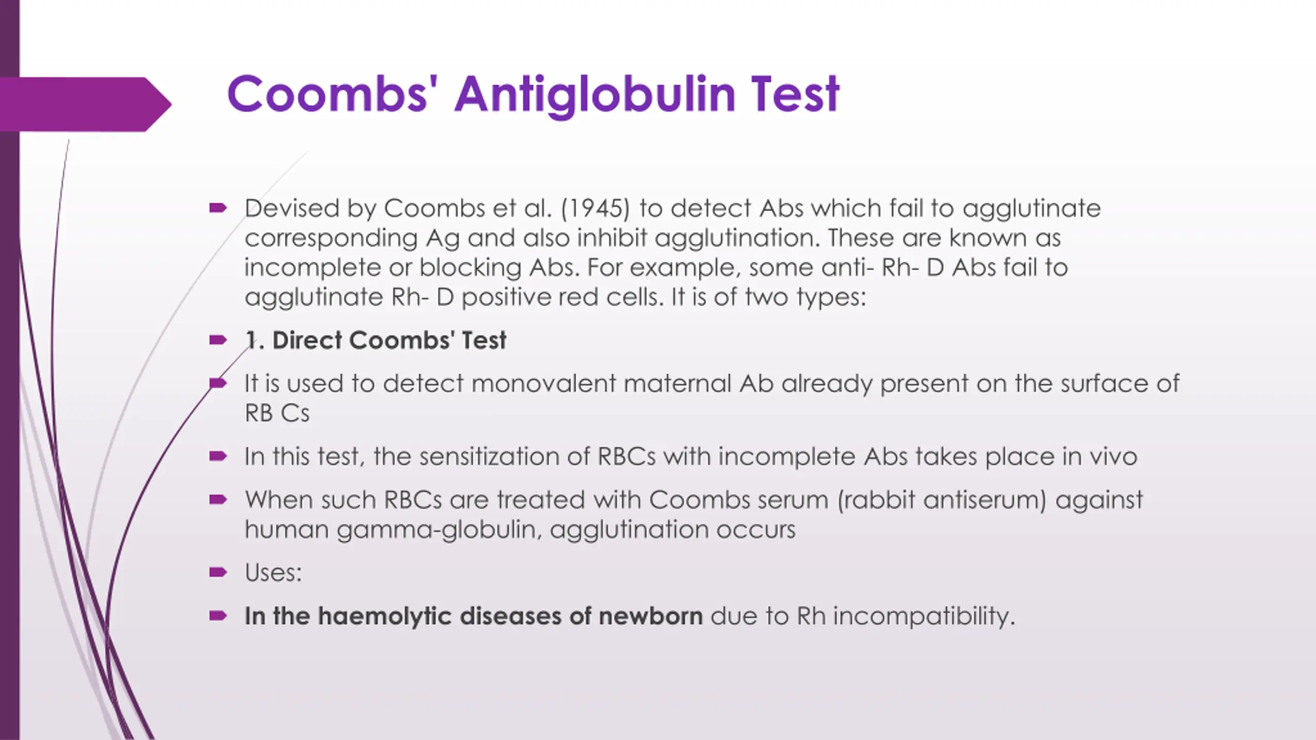 Coombs' Antiglobulin Test Devised by Coombs et al. (1945) to detect Abs which fail to agglutinate corresponding Ag and also inhibit agglutination. These are known as incomplete or blocking Abs. For example, some anti- Rh- D Abs fail to agglutinate Rh- D positive red cells. It is of two types: 1. Direct Coombs' Test It is used to detect monovalent maternal Ab already present on the surface of RB Cs In this test, the sensitization of RBCs with incomplete Abs takes place in vivo When such RBCs are treated with Coombs serum (rabbit antiserum) against human gamma-globulin, agglutination occurs Uses: In the haemolytic diseases of newborn due to Rh incompatibility.