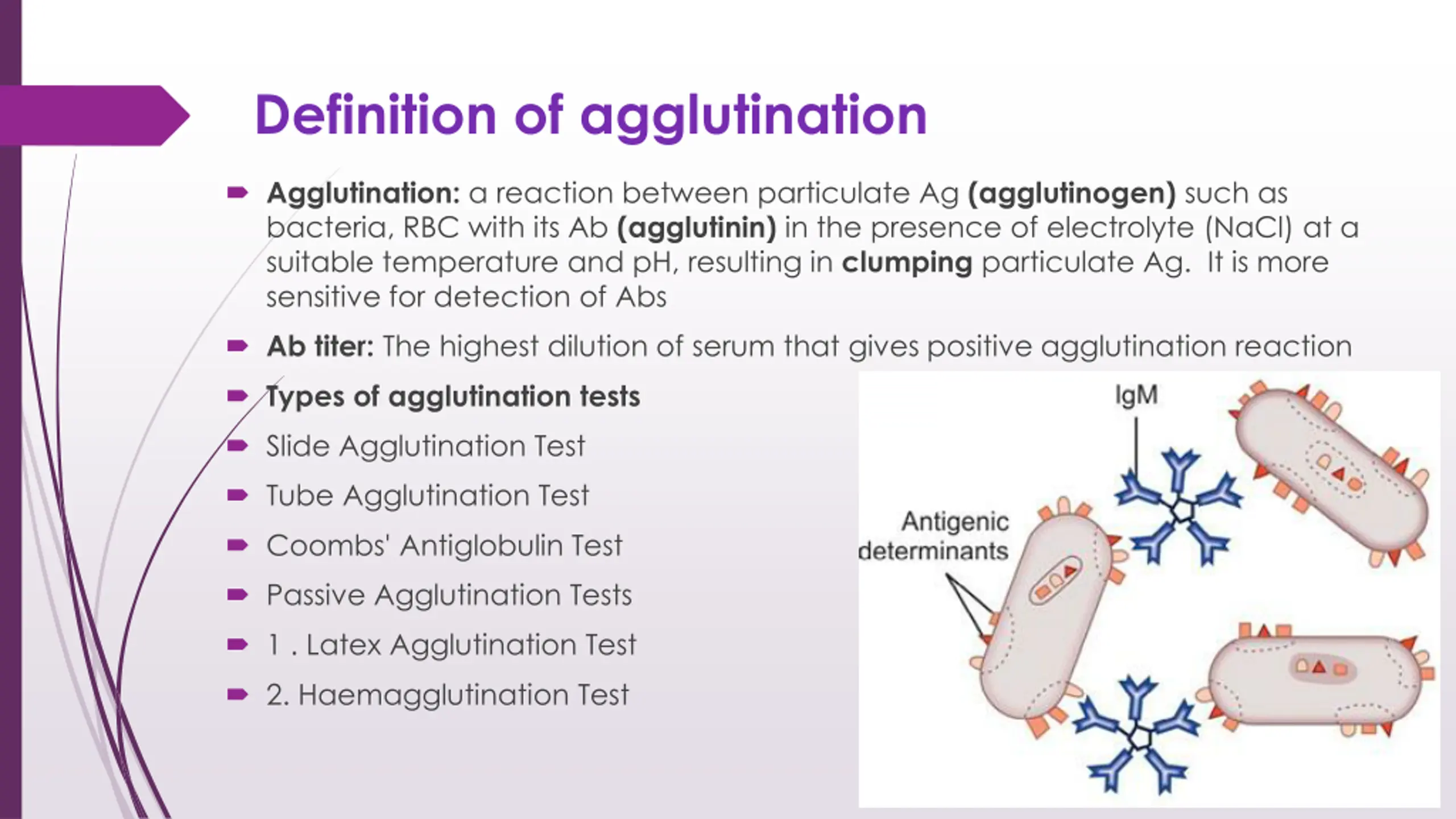 Definition of agglutination Agglutination: a reaction between particulate Ag (agglutinogen) such as bacteria, RBC with its Ab (agglutinin) in the presence of electrolyte (NaCl) at a suitable temperature and pH, resulting in clumping particulate Ag. It is more sensitive for detection of Abs Ab titer: The highest dilution of serum that gives positive agglutination reaction Types of agglutination tests Slide Agglutination Test Tube Agglutination Test Coombs' Antiglobulin Test Passive Agglutination Tests 1 . Latex Agglutination Test 2. Haemagglutination Test