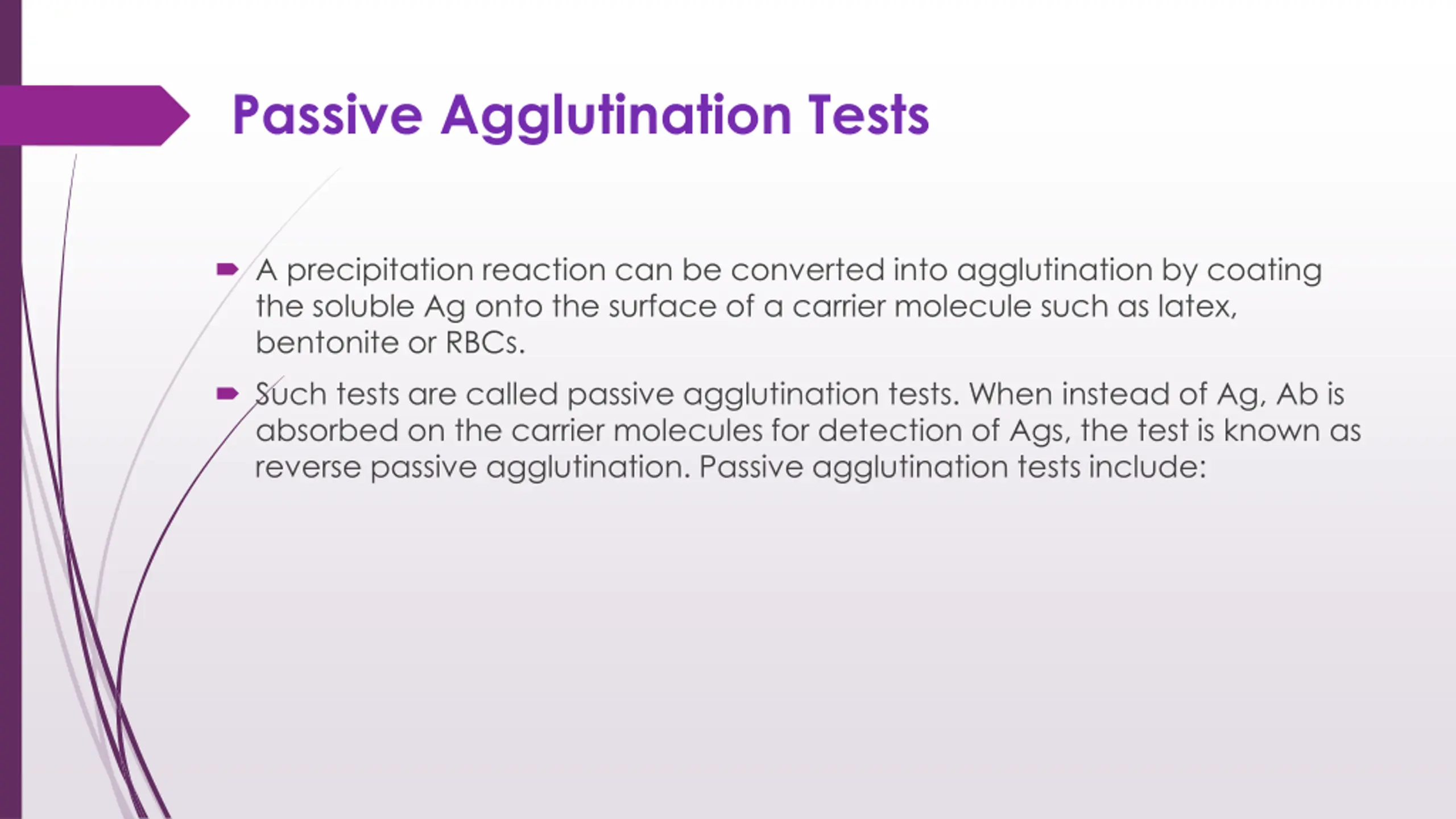 Passive Agglutination Tests A precipitation reaction can be converted into agglutination by coating the soluble Ag onto the surface of a carrier molecule such as latex, bentonite or RBCs. Such tests are called passive agglutination tests. When instead of Ag, Ab is absorbed on the carrier molecules for detection of Ags, the test is known as reverse passive agglutination. Passive agglutination tests include: