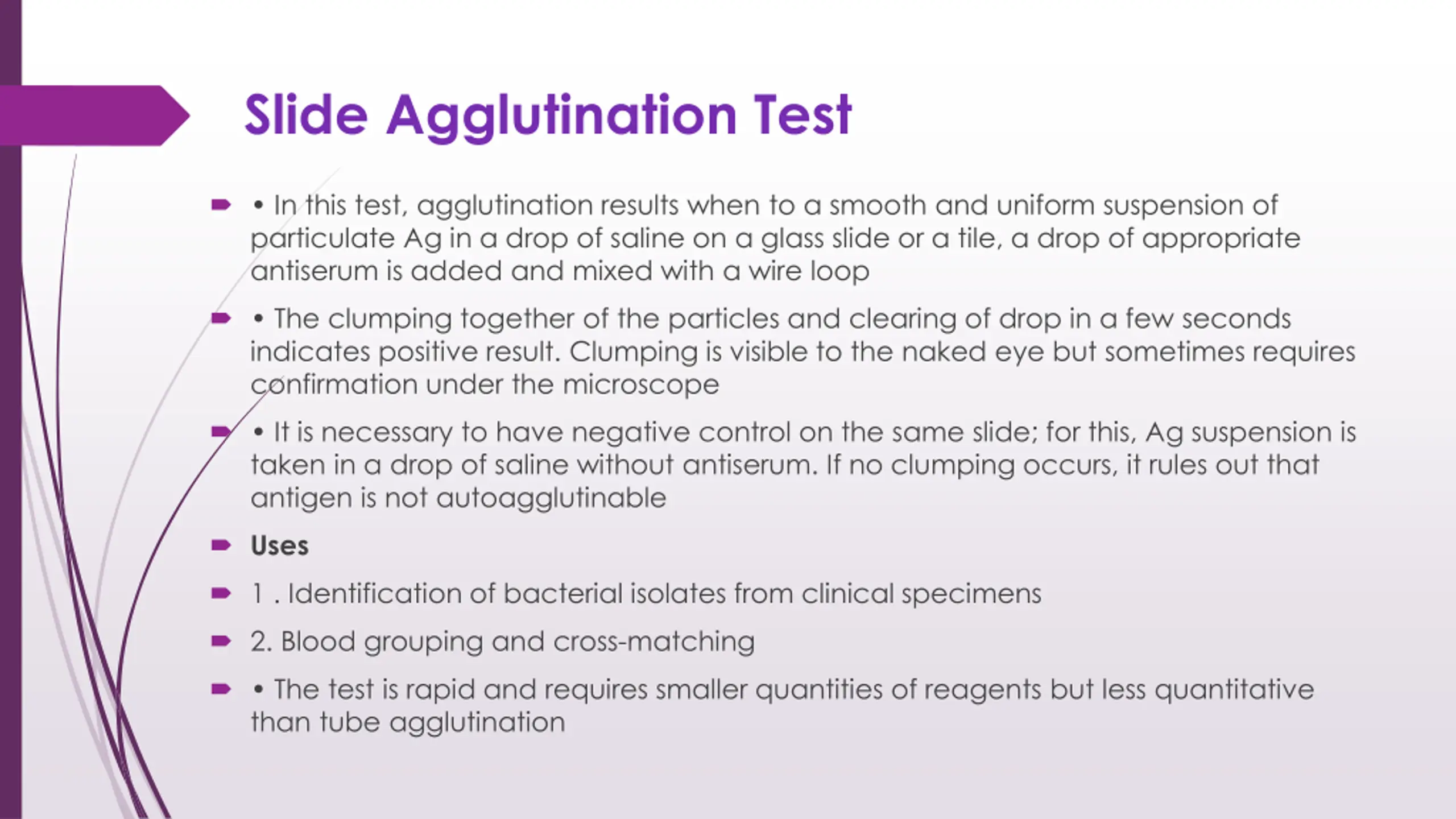 Slide Agglutination Test In this test, agglutination results when to a smooth and uniform suspension of particulate Ag in a drop of saline on a glass slide or a tile, a drop of appropriate antiserum is added and mixed with a wire loop The clumping together of the particles and clearing of drop in a few seconds indicates positive result. Clumping is visible to the naked eye but sometimes requires confirmation under the microscope It is necessary to have negative control on the same slide; for this, Ag suspension is taken in a drop of saline without antiserum. If no clumping occurs, it rules out that antigen is not autoagglutinable Uses 1 . Identification of bacterial isolates from clinical specimens 2. Blood grouping and cross-matching The test is rapid and requires smaller quantities of reagents but less quantitative than tube agglutination