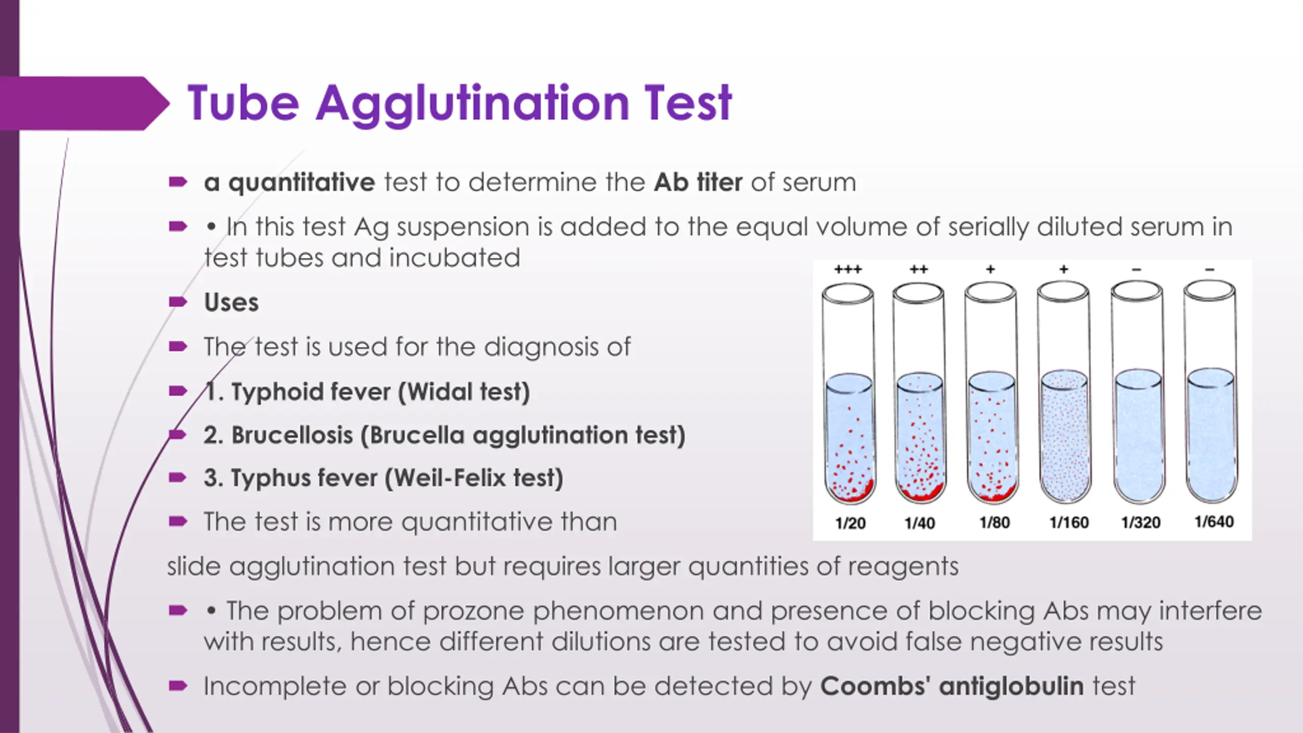 Tube Agglutination Test a quantitative test to determine the Ab titer of serum In this test Ag suspension is added to the equal volume of serially diluted serum in test tubes and incubated Uses The test is used for the diagnosis of 1. Typhoid fever (Widal test) 2. Brucellosis (Brucella agglutination test) 3. Typhus fever (Weil-Felix test) The test is more quantitative than slide agglutination test but requires larger quantities of reagents The problem of prozone phenomenon and presence of blocking Abs may interfere with results, hence different dilutions are tested to avoid false negative results Incomplete or blocking Abs can be detected by Coombs' antiglobulin test