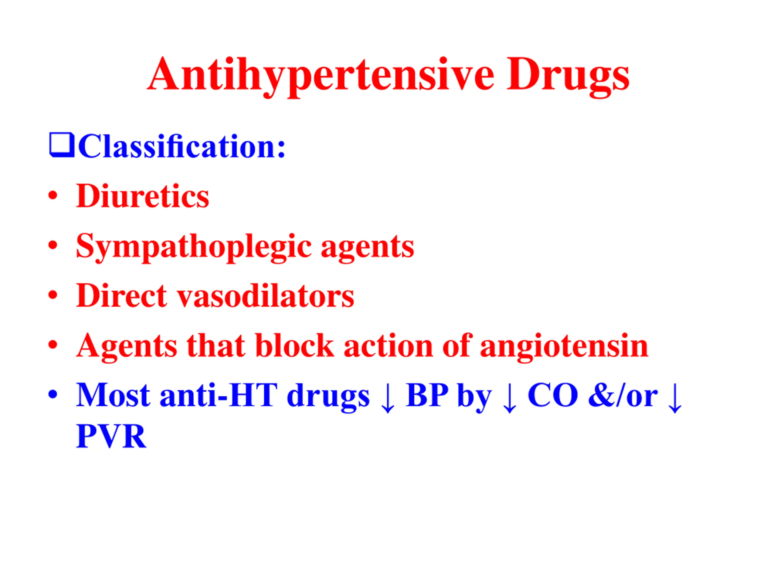 Antihypertensive Drugs Classification: Diuretics Sympathoplegic agents Direct vasodilators Agents that block action of angiotensin Most anti-HT drugs BP by CO &/or PVR