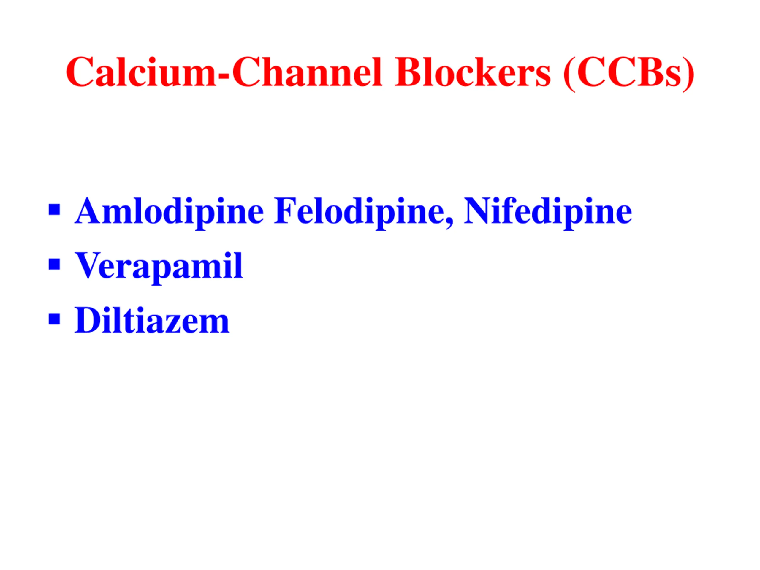 Calcium-Channel Blockers (CCBs) Amlodipine Felodipine, Nifedipine Verapamil Diltiazem
