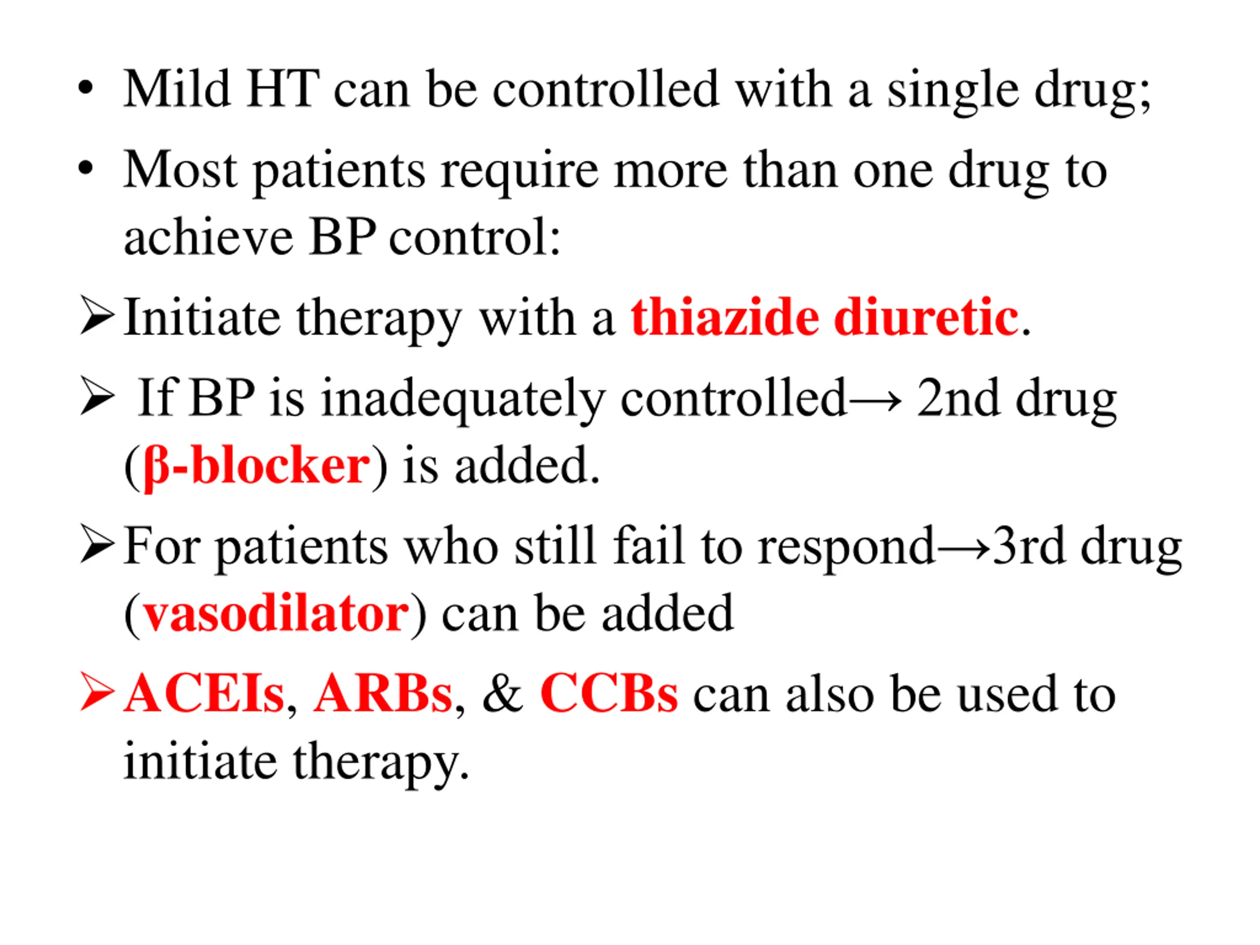 Mild HT can be controlled with a single drug; Most patients require more than one drug to achieve BP control: Initiate therapy with a thiazide diuretic. If BP is inadequately controlled 2nd drug ( -blocker) is added. For patients who still fail to respond 3rd drug (vasodilator) can be added ACEIs, ARBs, & CCBs can also be used to initiate therapy.