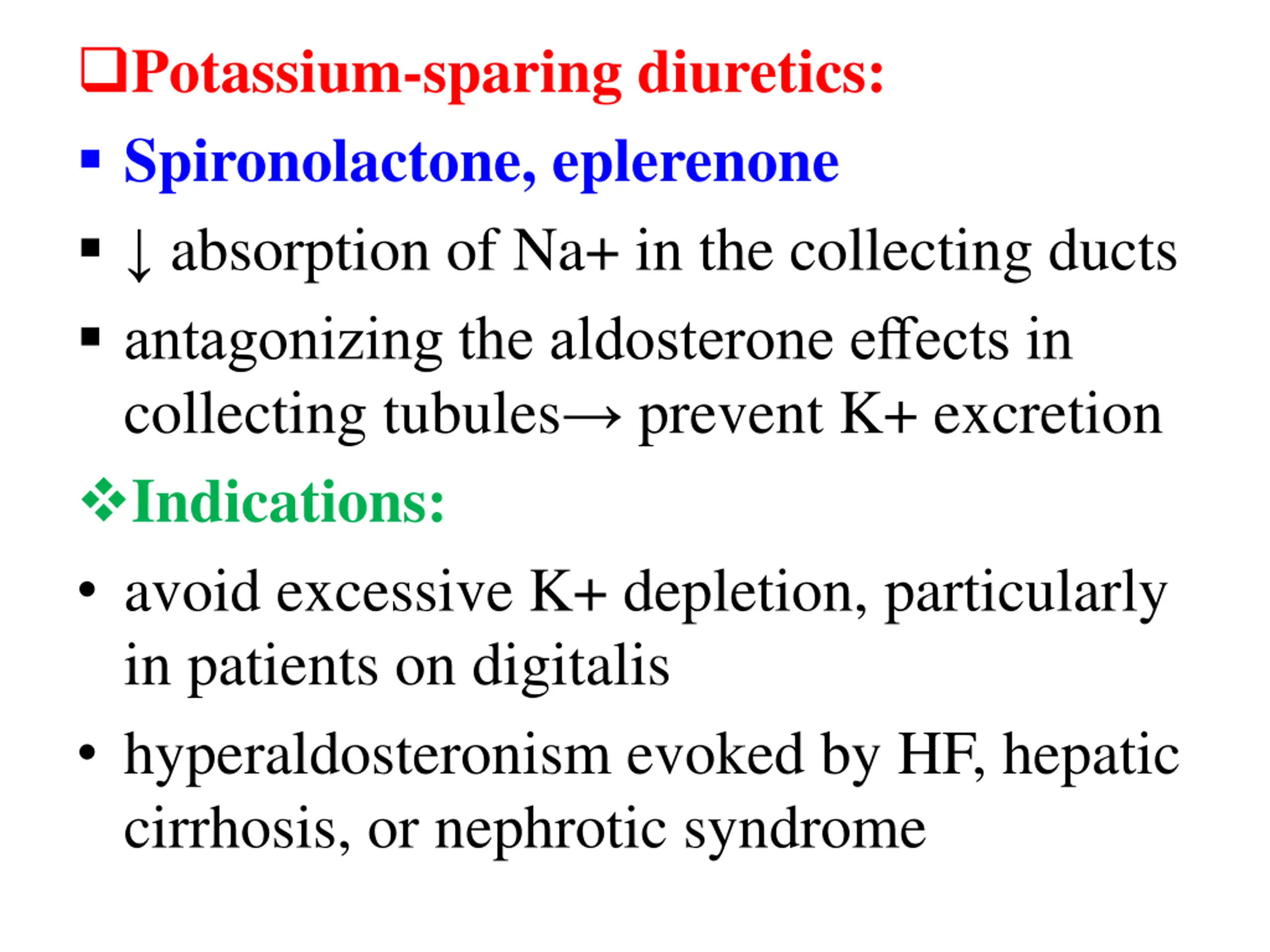 Potassium-sparing diuretics: Spironolactone, eplerenone absorption of Na+ in the collecting ducts antagonizing the aldosterone effects in collecting tubules prevent K+ excretion Indications: avoid excessive K+ depletion, particularly in patients on digitalis hyperaldosteronism evoked by HF, hepatic cirrhosis, or nephrotic syndrome