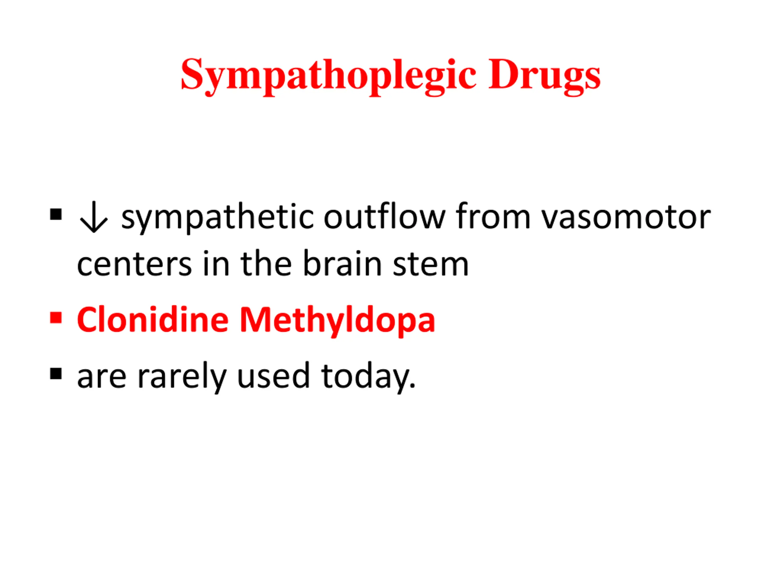 Sympathoplegic Drugs sympathetic outflow from vasomotor centers in the brain stem Clonidine Methyldopa are rarely used today.