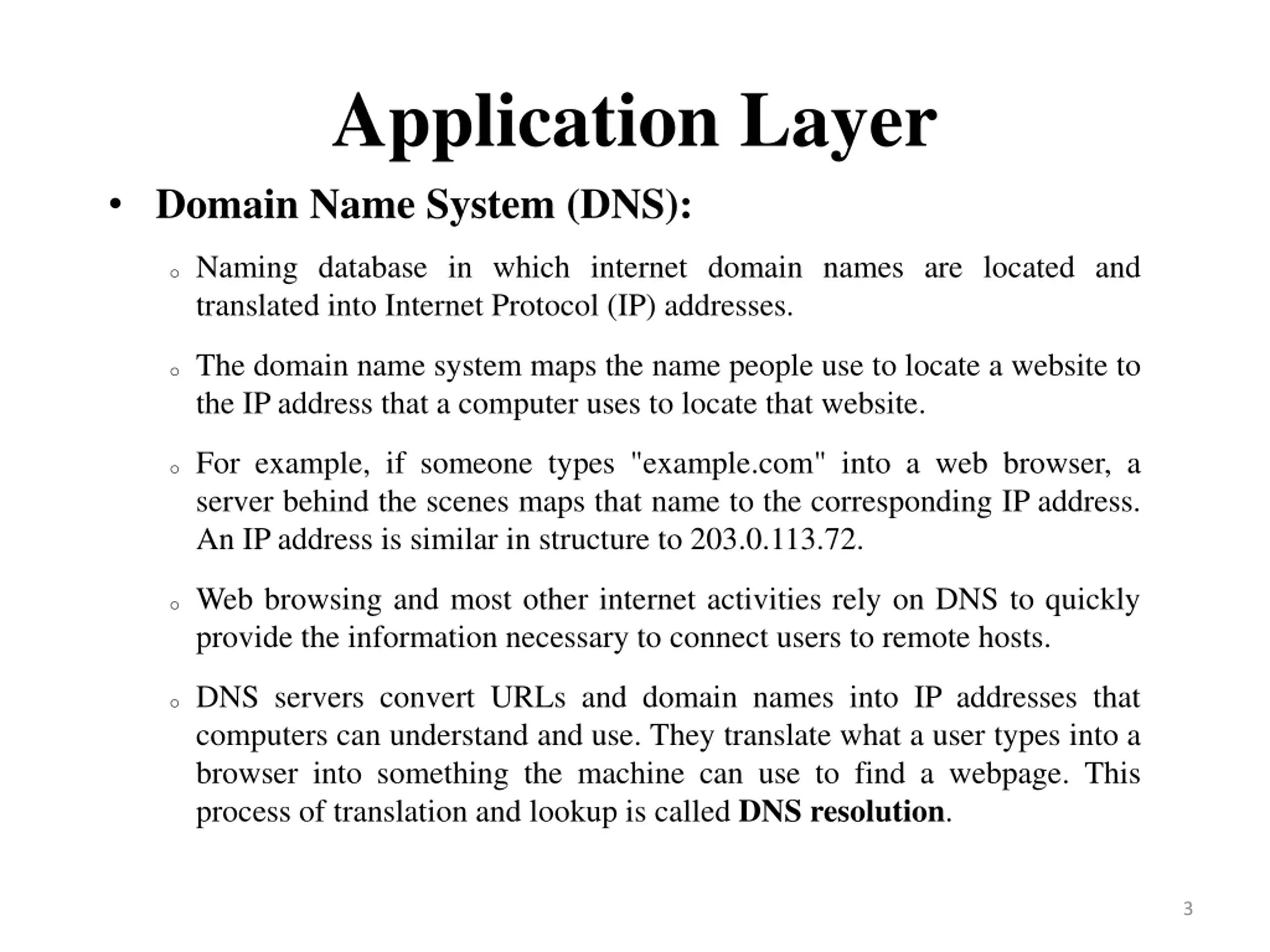 Application Layer Domain Name System (DNS): o Naming database in which internet domain names are located and translated into Internet Protocol (IP) addresses. o The domain name system maps the name people use to locate a website to the IP address that a computer uses to locate that website. o For example, if someone types "example.com" into a web browser, a server behind the scenes maps that name to the corresponding IP address. An IP address is similar in structure to 203.0.113.72. o Web browsing and most other internet activities rely on DNS to quickly provide the information necessary to connect users to remote hosts. o DNS servers convert URLs and domain names into IP addresses that computers can understand and use. They translate what a user types into a browser into something the machine can use to find a webpage. This process of translation and lookup is called DNS resolution. 3