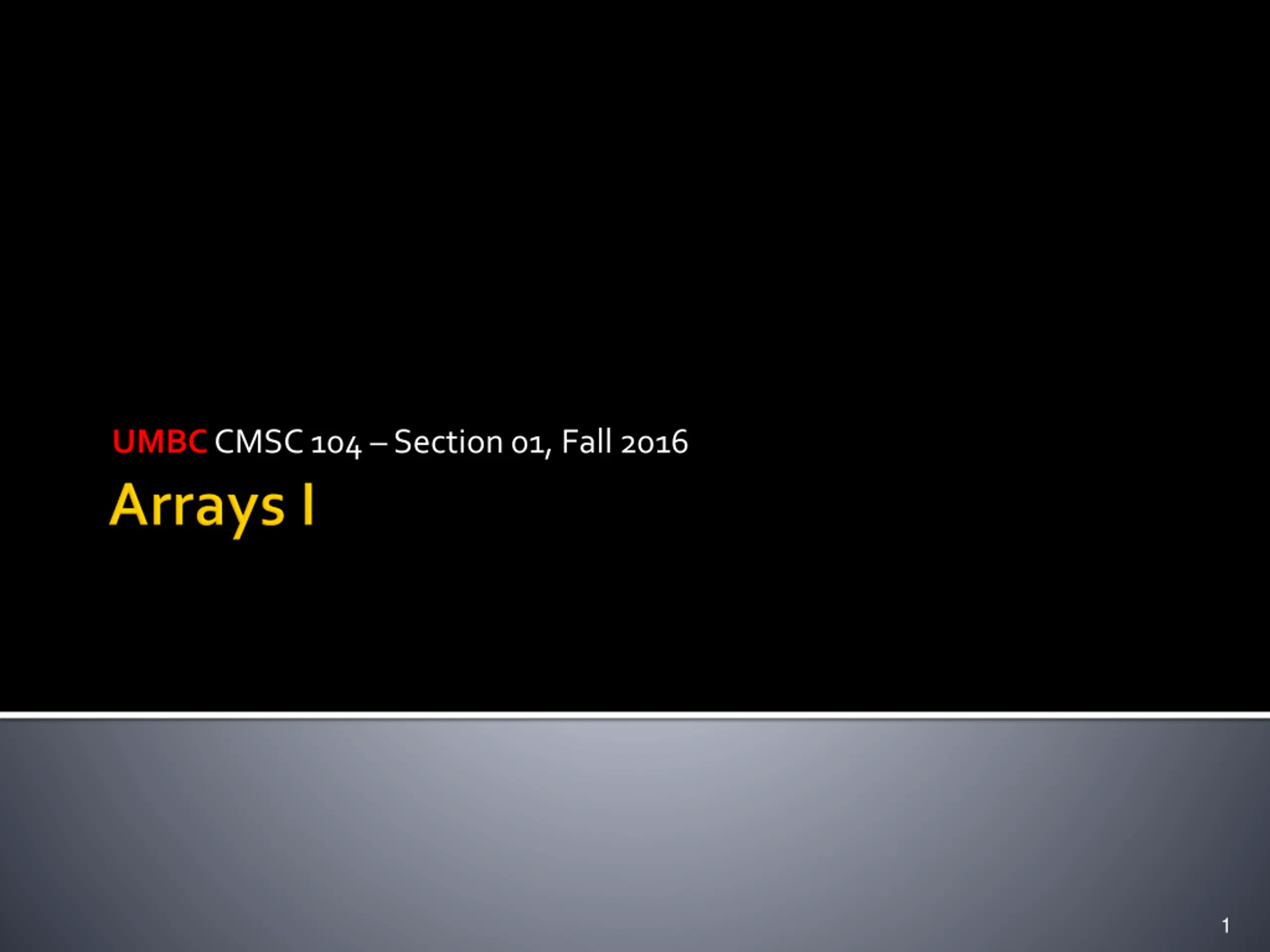 int score [39] , gradeCount [5]; Declares two arrays of type int. Neither array has been initialized. score contains 39 elements (one for each student in a class). gradeCount contains 5 elements (one for each possible grade, A - F). UMBC CMSC 104, Section 01 - Fall 2016