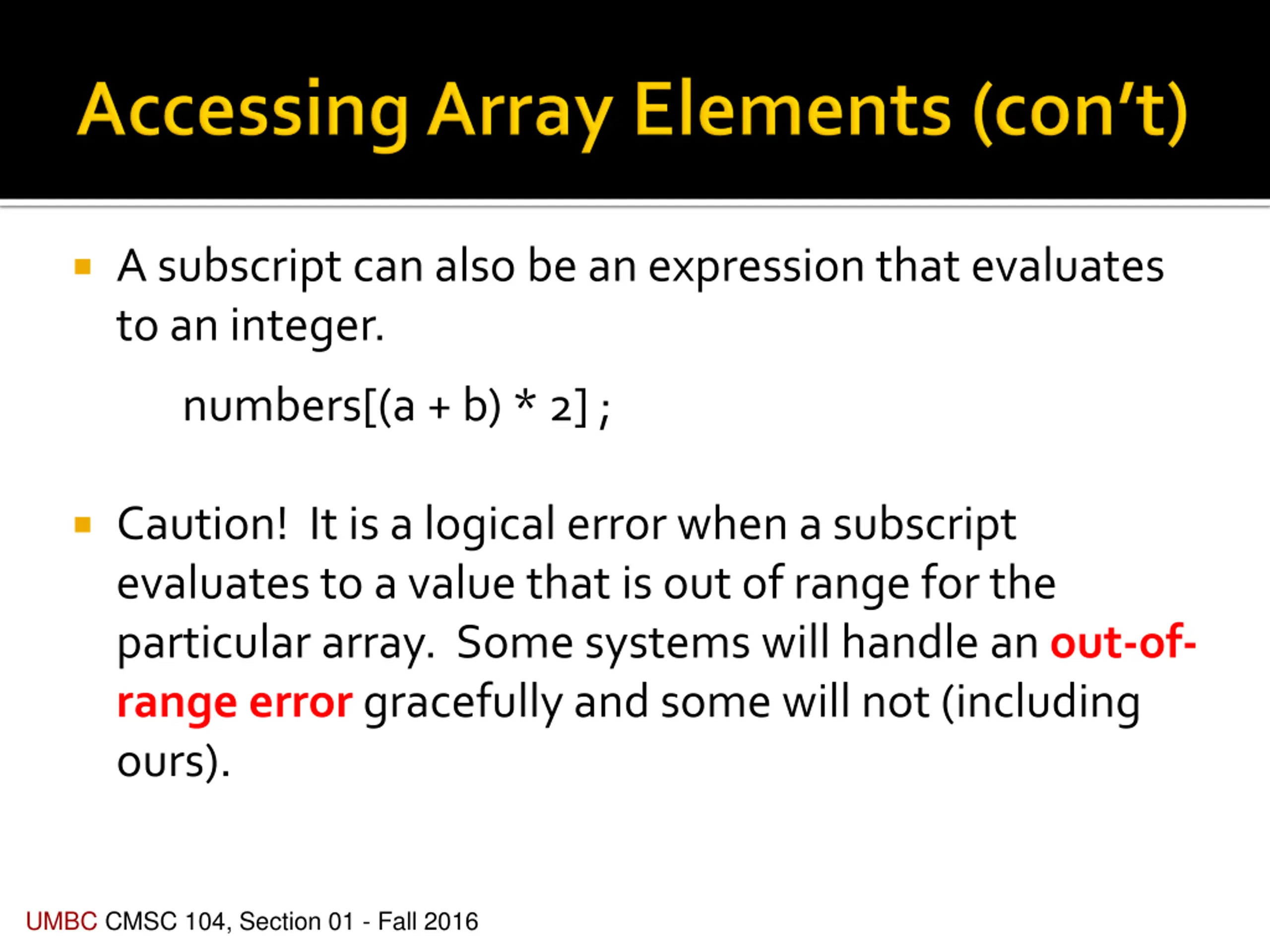 A subscript can also be an expression that evaluates to an integer. numbers[(a + b) * 2] ; Caution! It is a logical error when a subscript evaluates to a value that is out of range for the particular array. Some systems will handle an out-of- range error gracefully and some will not (including ours). UMBC CMSC 104, Section 01 - Fall 2016