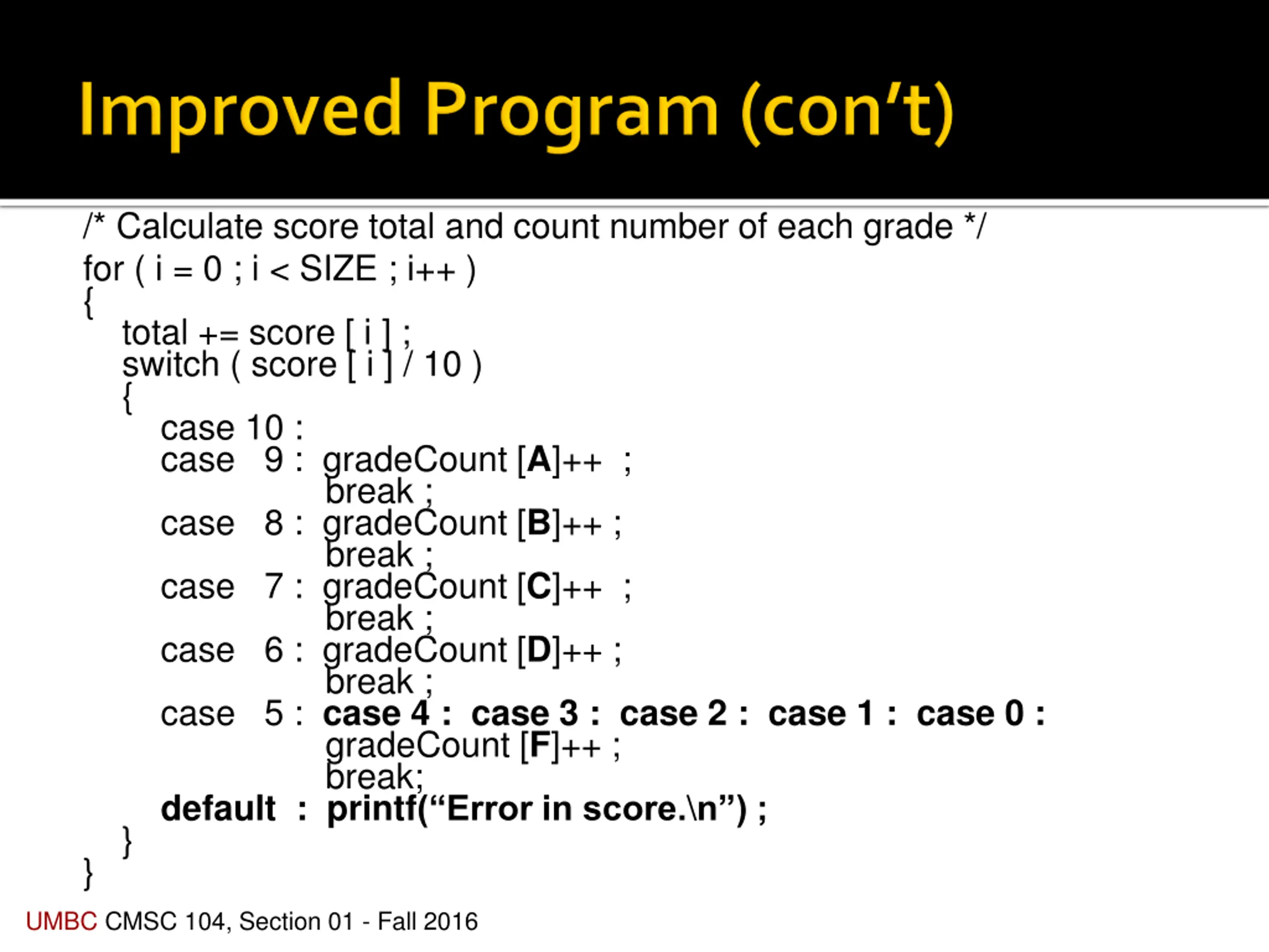 /* Calculate score total and count number of each grade */ for ( i = 0 ; i < SIZE ; i++ ) { total += score [ i ] ; switch ( score [ i ] / 10 ) { case 10 : case 9 : gradeCount [A]++ ; break ; case 8 : gradeCount [B]++ ; break ; case 7 : gradeCount [C]++ ; break ; case 6 : gradeCount [D]++ ; break ; case 5 : case 4 : case 3 : case 2 : case 1 : case 0 : gradeCount [F]++ ; break; default : printf( Error in score.\n ) ; } } UMBC CMSC 104, Section 01 - Fall 2016