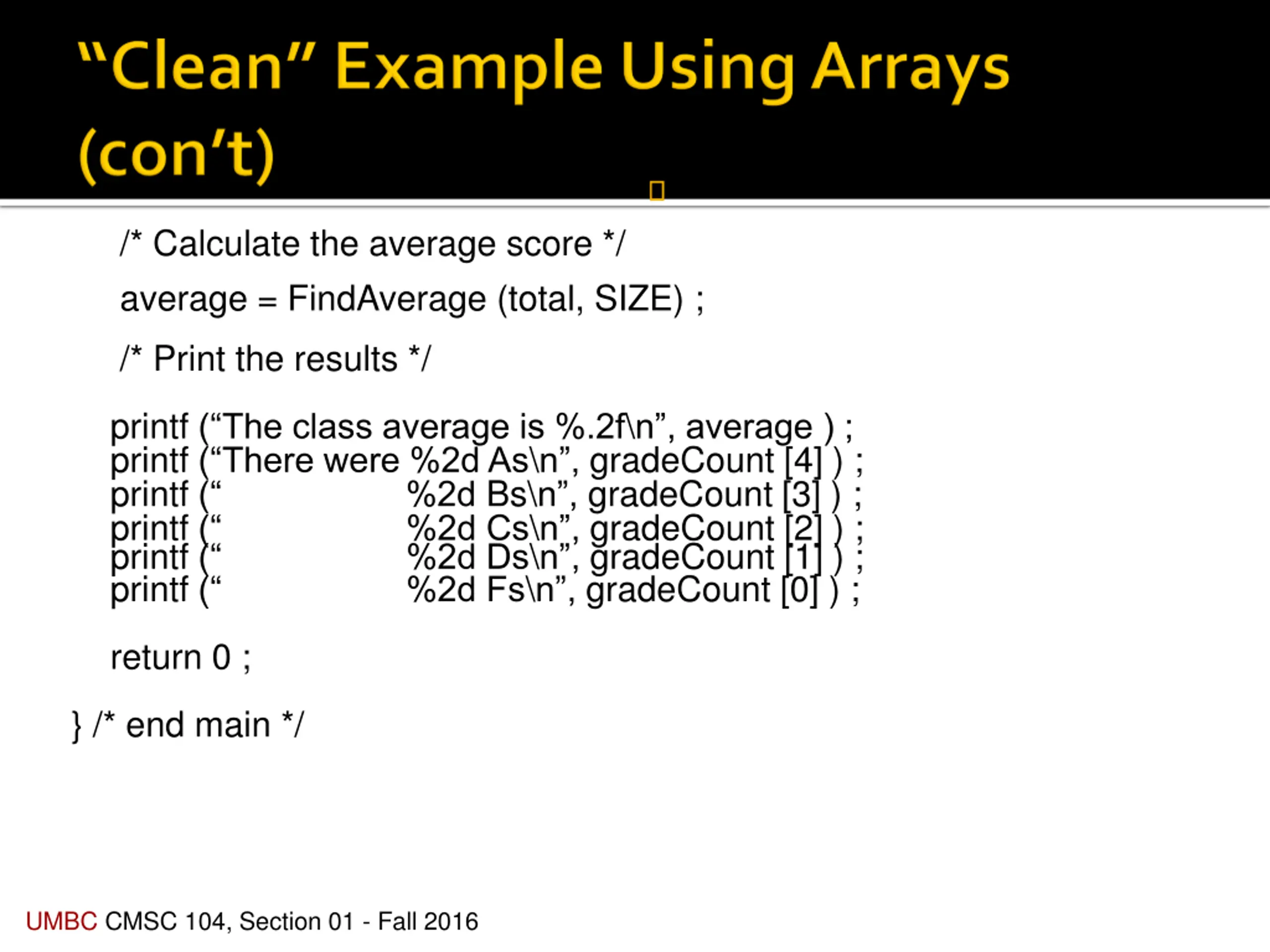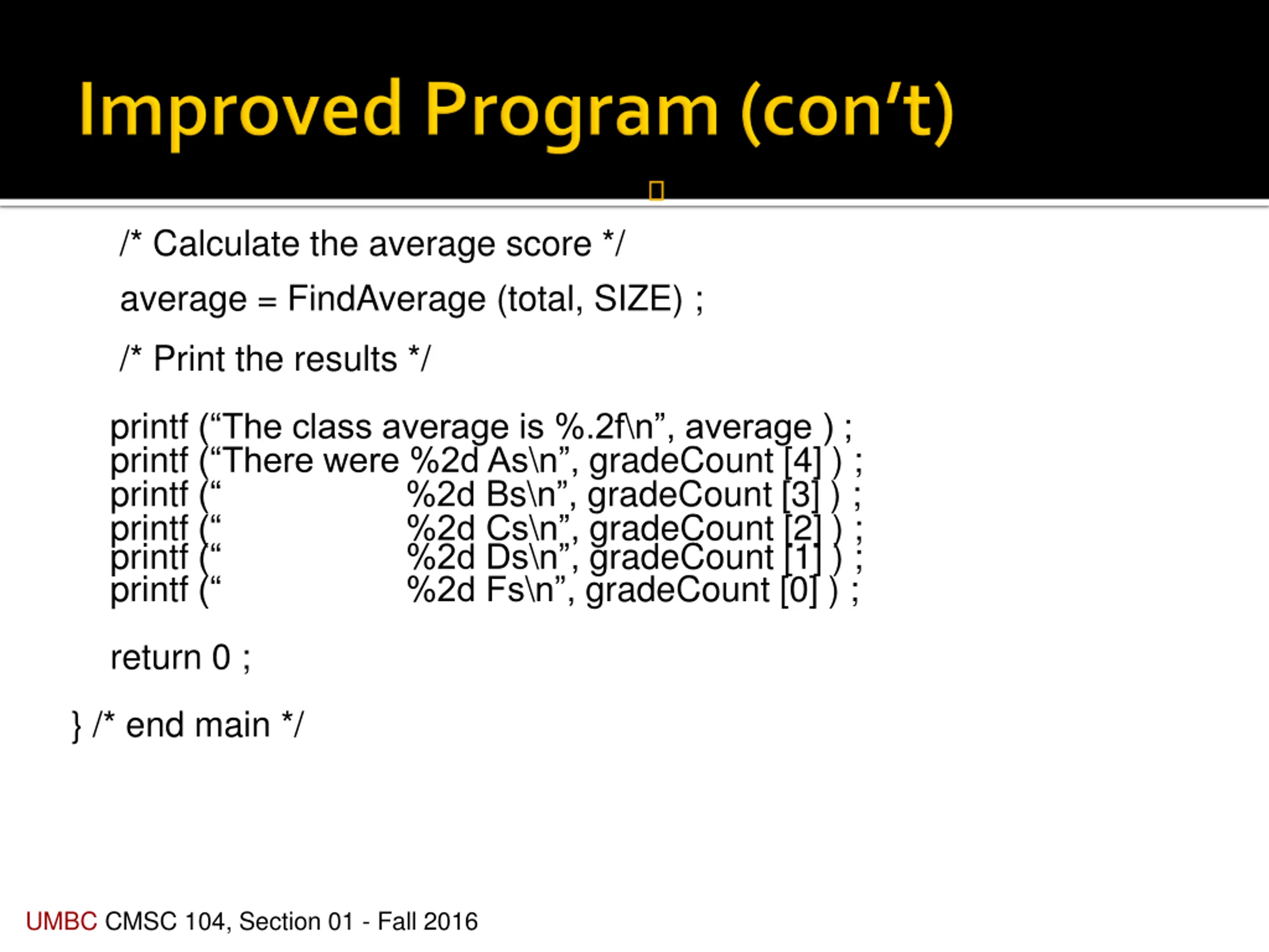/* Calculate the average score */ average = FindAverage (total, SIZE) ; /* Print the results */ printf ( The class average is %.2f\n , average ) ; printf ( There were %2d As\n , gradeCount [4] ) ; printf ( %2d Bs\n , gradeCount [3] ) ; printf ( %2d Cs\n , gradeCount [2] ) ; printf ( %2d Ds\n , gradeCount [1] ) ; printf ( %2d Fs\n , gradeCount [0] ) ; return 0 ; } /* end main */ UMBC CMSC 104, Section 01 - Fall 2016