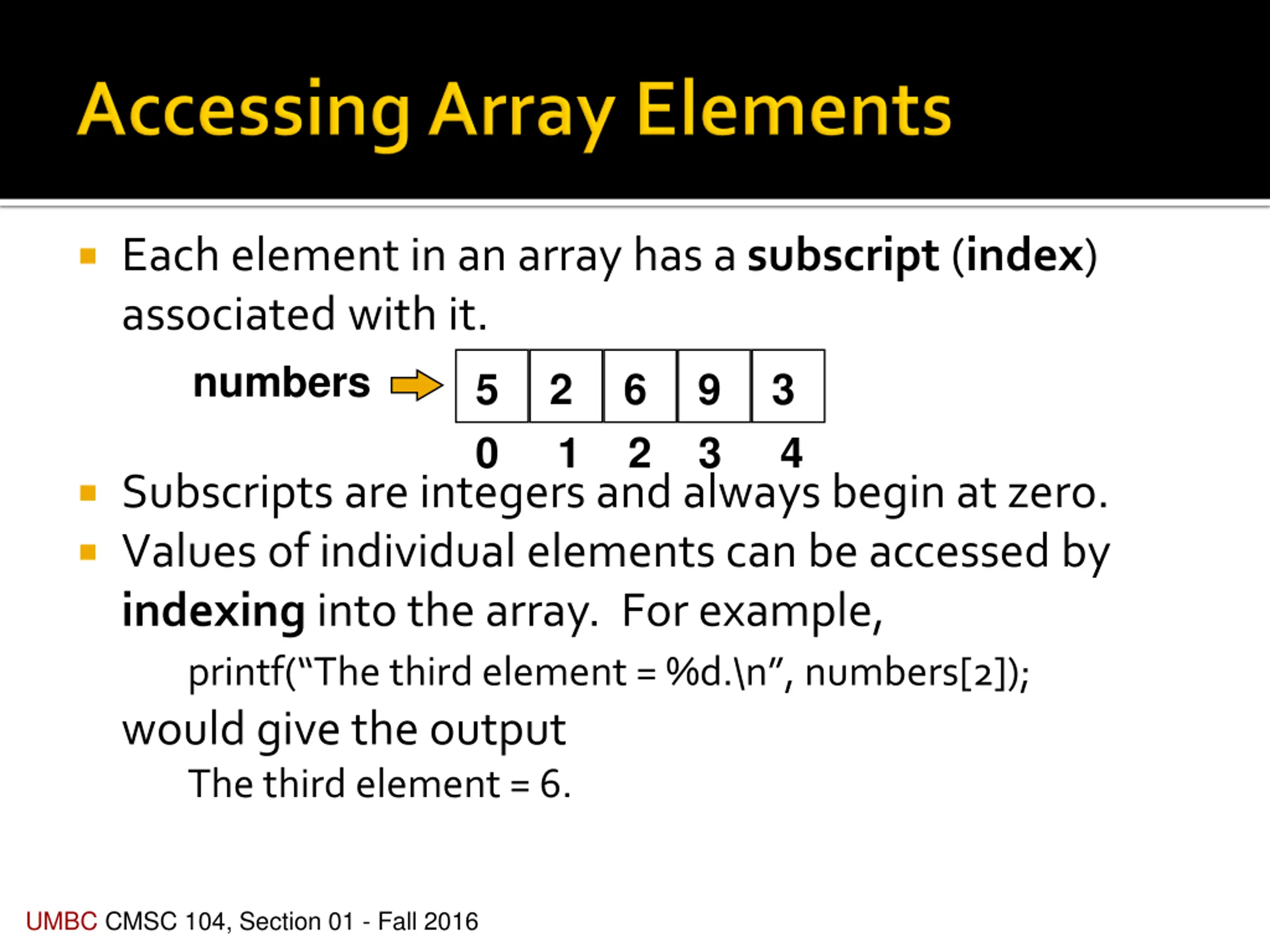 Each element in an array has a subscript (index) associated with it. numbers 0 1 2 3 4 5 2 6 9 3 Subscripts are integers and always begin at zero. Values of individual elements can be accessed by indexing into the array. For example, printf( The third element = %d.\n , numbers[2]); would give the output The third element = 6. UMBC CMSC 104, Section 01 - Fall 2016
