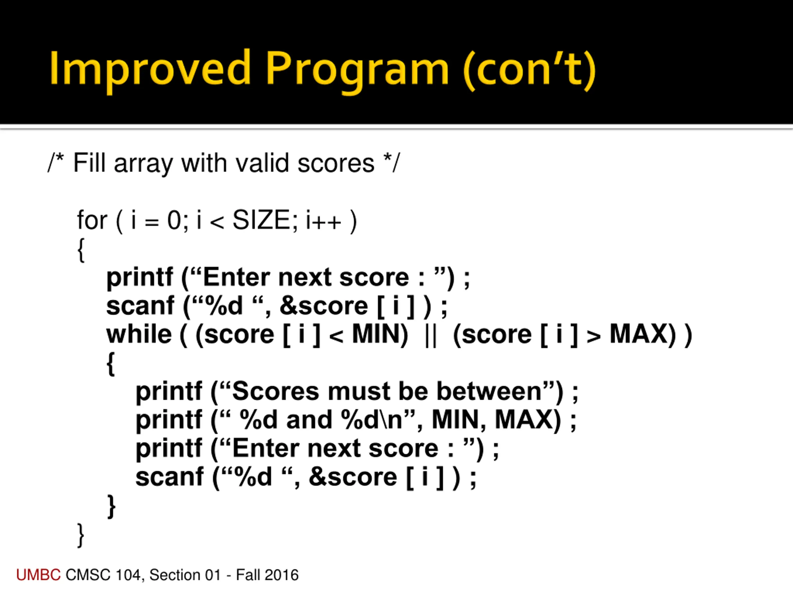 /* Fill array with valid scores */ for ( i = 0; i < SIZE; i++ ) { printf ( Enter next score : ) ; scanf ( %d , &score [ i ] ) ; while ( (score [ i ] < MIN) || (score [ i ] > MAX) ) { printf ( Scores must be between ) ; printf ( %d and %d\n , MIN, MAX) ; printf ( Enter next score : ) ; scanf ( %d , &score [ i ] ) ; } } UMBC CMSC 104, Section 01 - Fall 2016