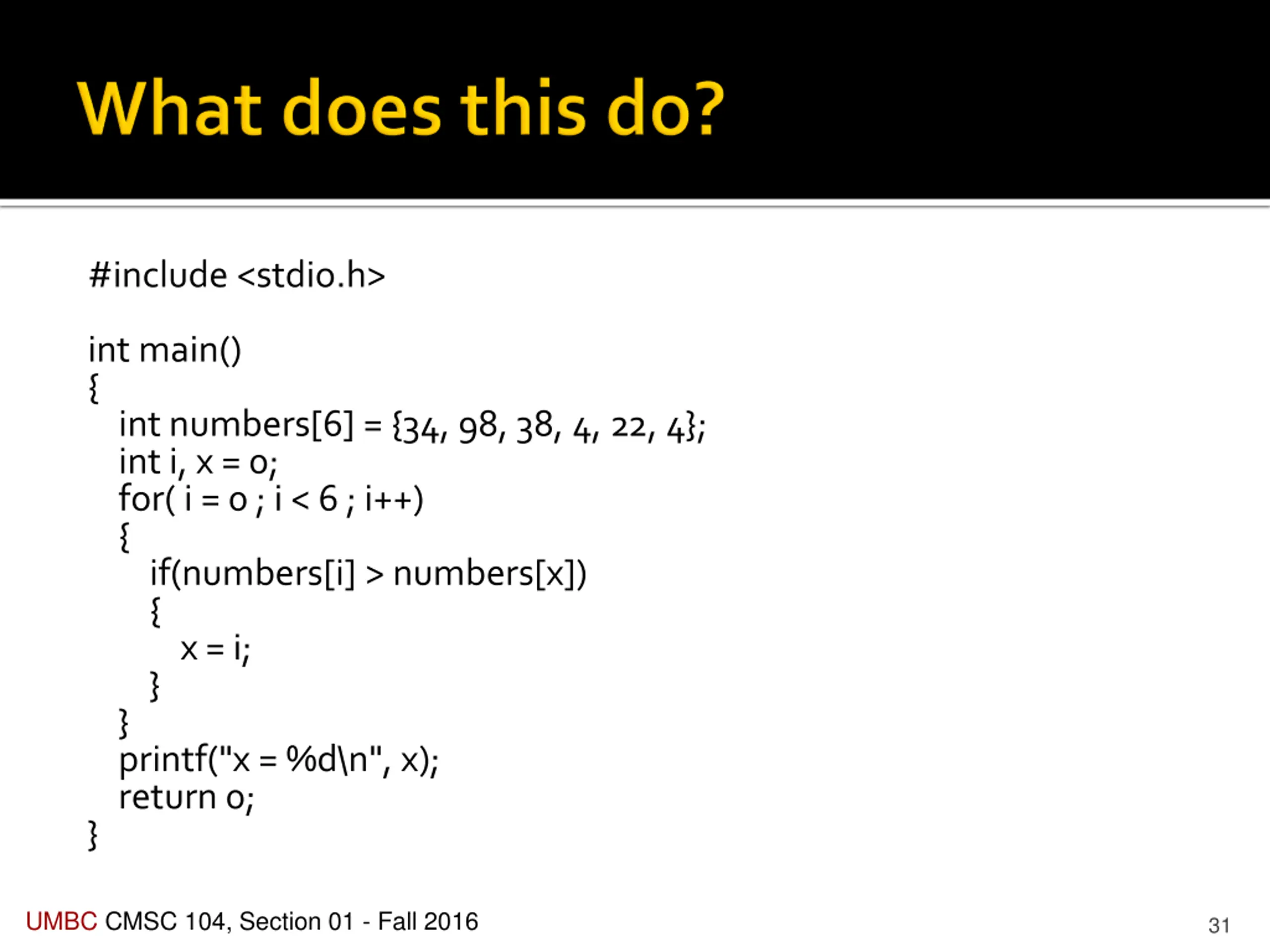 #include <stdio.h> int main() { int numbers[6] = {34, 98, 38, 4, 22, 4}; int i, x = 0; for( i = 0 ; i < 6 ; i++) { if(numbers[i] > numbers[x]) { x = i; } } printf("x = %d\n", x); return 0; } UMBC CMSC 104, Section 01 - Fall 2016 31