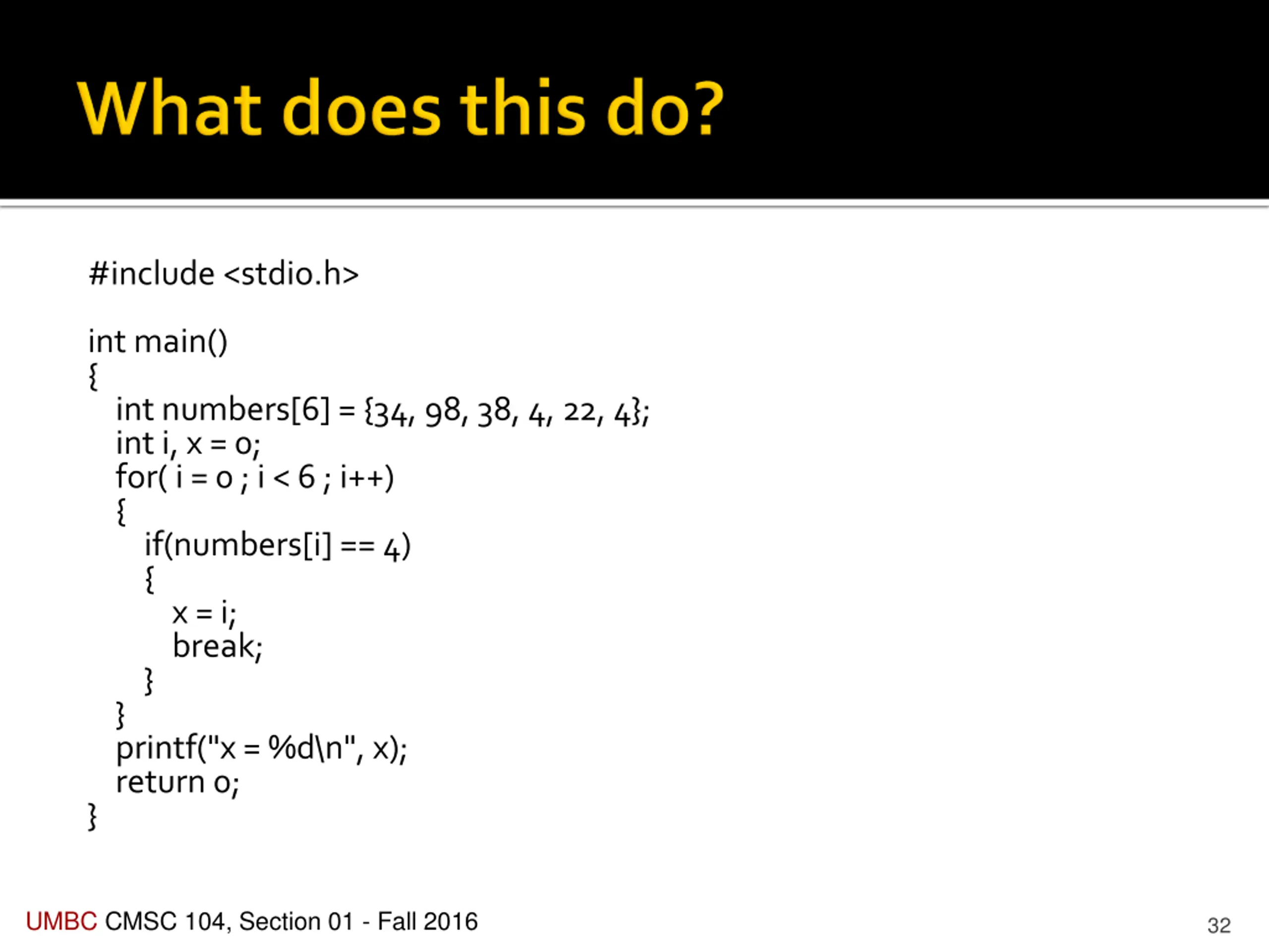 #include <stdio.h> int main() { int numbers[6] = {34, 98, 38, 4, 22, 4}; int i, x = 0; for( i = 0 ; i < 6 ; i++) { if(numbers[i] == 4) { x = i; break; } } printf("x = %d\n", x); return 0; } UMBC CMSC 104, Section 01 - Fall 2016 32