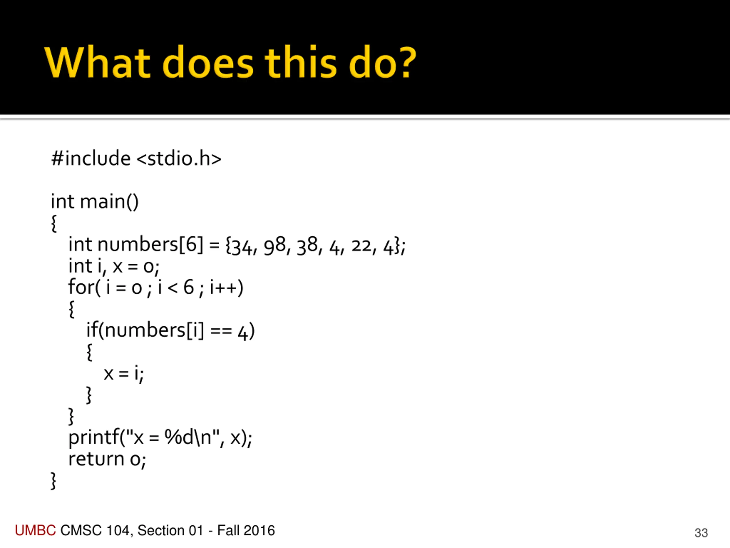 #include <stdio.h> int main() { int numbers[6] = {34, 98, 38, 4, 22, 4}; int i, x = 0; for( i = 0 ; i < 6 ; i++) { if(numbers[i] == 4) { x = i; } } printf("x = %d\n", x); return 0; } UMBC CMSC 104, Section 01 - Fall 2016 33