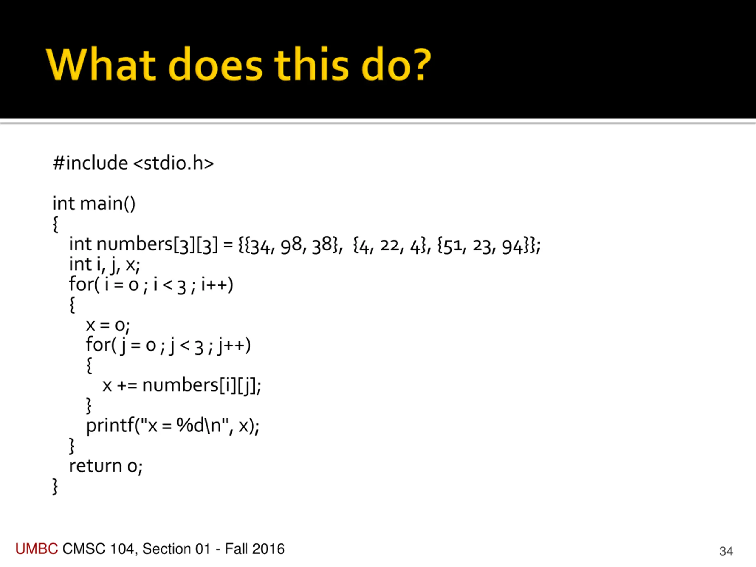 #include <stdio.h> int main() { int numbers[3][3] = {{34, 98, 38}, {4, 22, 4}, {51, 23, 94}}; int i, j, x; for( i = 0 ; i < 3 ; i++) { x = 0; for( j = 0 ; j < 3 ; j++) { x += numbers[i][j]; } printf("x = %d\n", x); } return 0; } UMBC CMSC 104, Section 01 - Fall 2016 34
